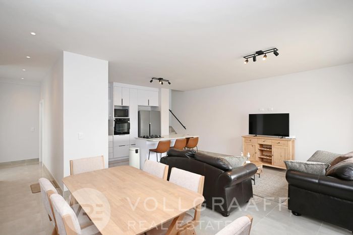 Coastal living steps from Dolphin Beach — open-plan townhouse with built-in braai, outdoor deck and private balcony with sea glimpses; front courtyard garden. Three beds, two baths and garage.