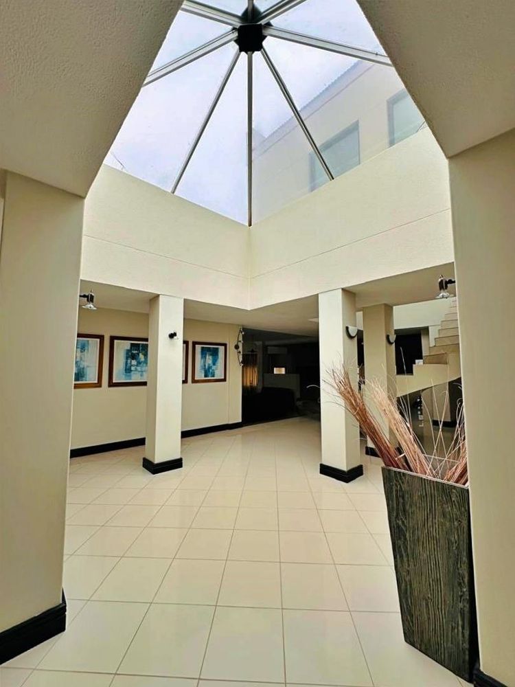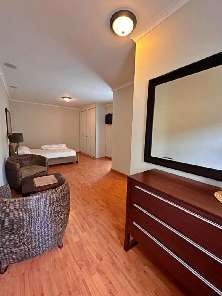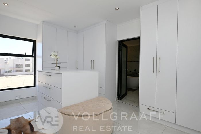 A striking hanging spiral staircase, bathed in natural light from a skylight above, leads you to the upper level. Here, a pajama lounge offers a cozy retreat, with direct access to the luxurious main bedroom. The main suite includes a lavish ensuite bathroom and a large walk-in closet. Adjacent to the main bedroom, you’ll find a versatile space that can be used as a gym or an additional bedroom, tailored to your specific needs.