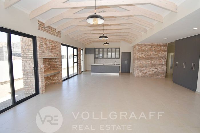 Effortless family living in Kramersdorf, perfect for entertaining with an indoor braai and airy exposed trusses; open-plan kitchen, three bedrooms, two bathrooms and double garage.