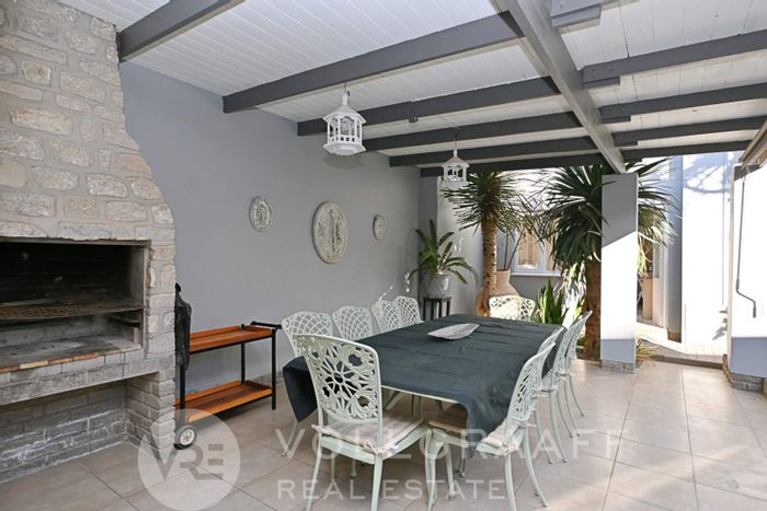 Step inside, and the double-volume entrance greets you with warmth and light. Crystal chandeliers sparkle against textured brickwork, setting the tone for interiors that balance industrial character with refined elegance. The open-plan lounge and dining room invite family gatherings, while sliding doors create a seamless flow to the outdoors — where a covered braai patio and sunken firepit courtyard promise evenings filled with laughter and friends.