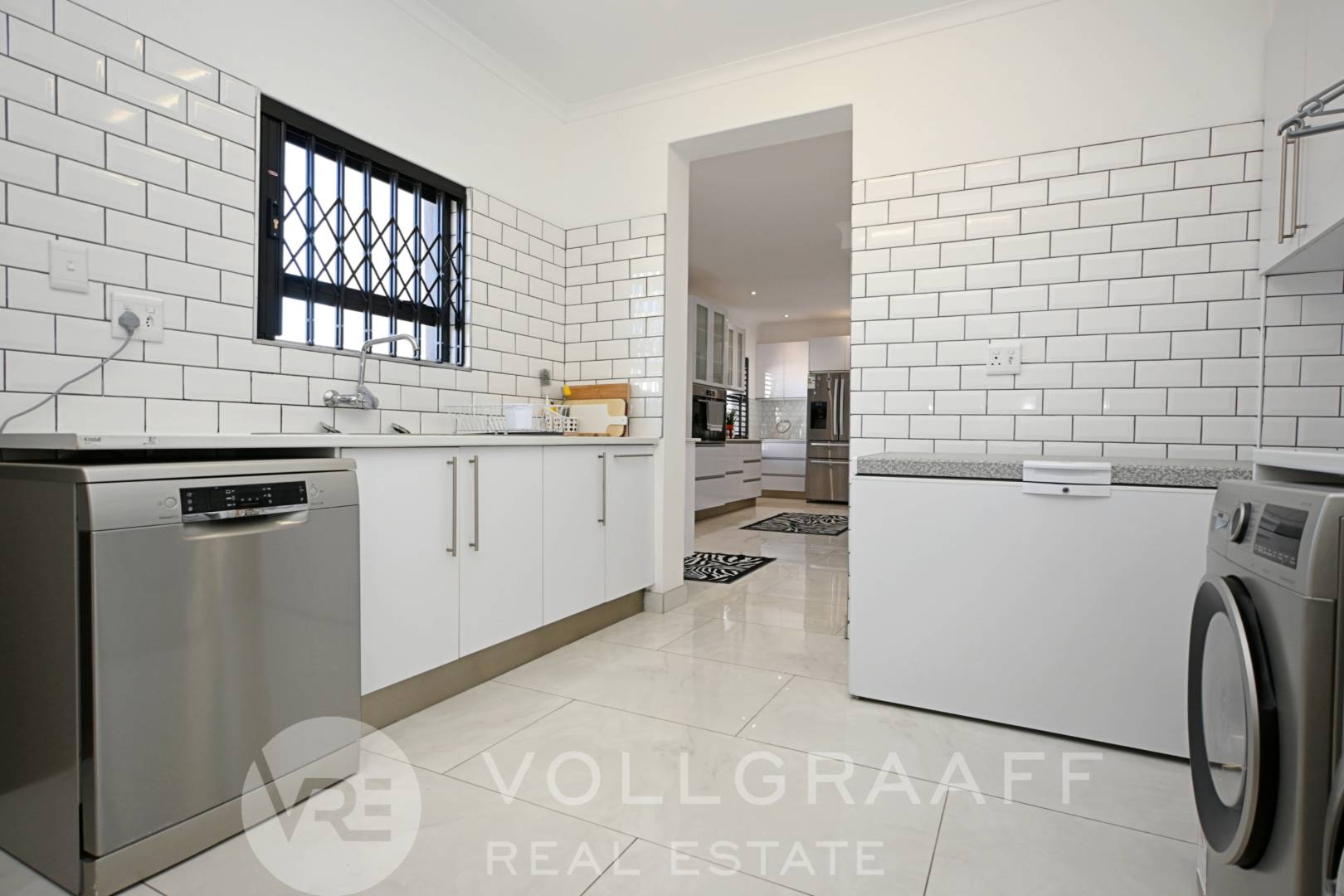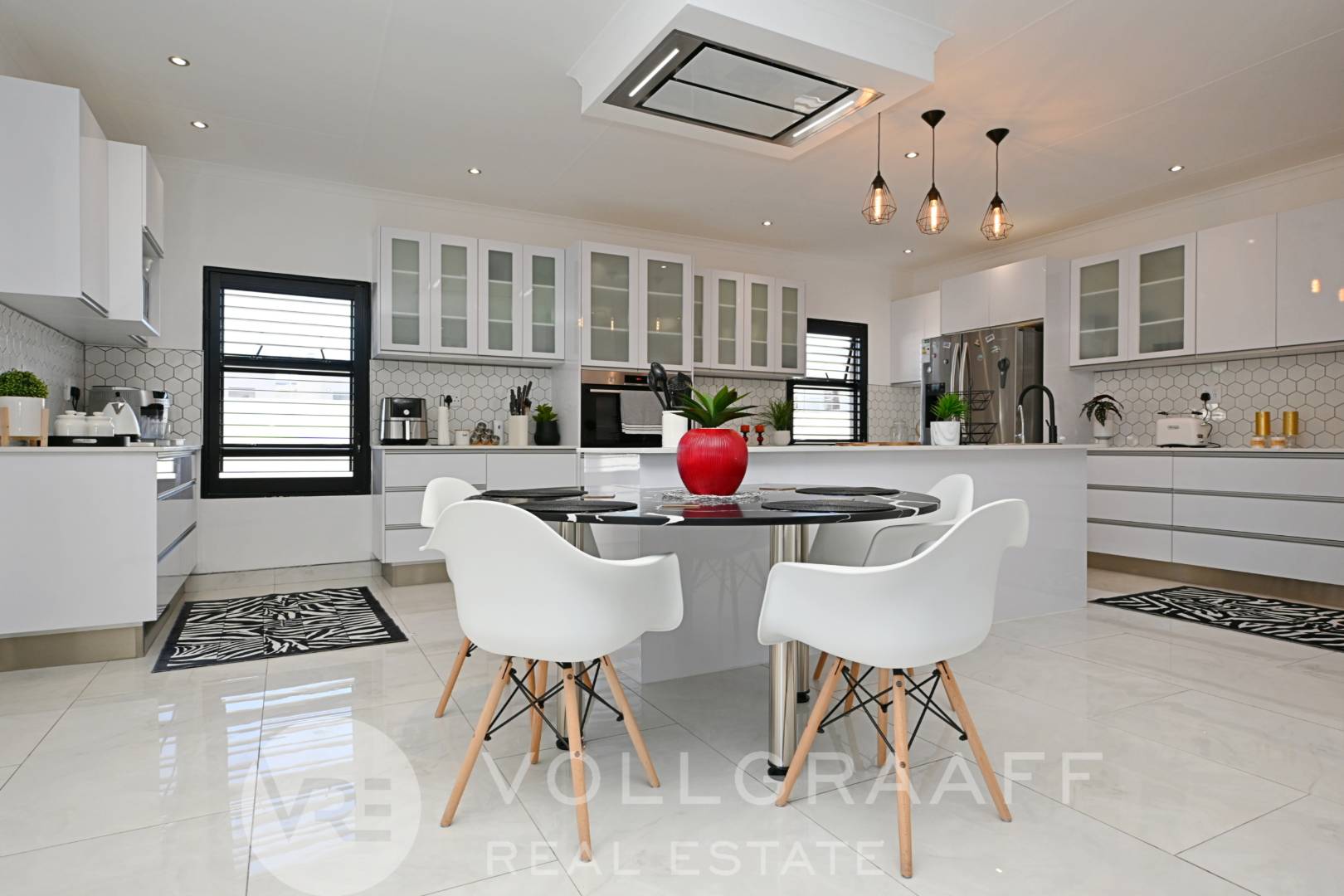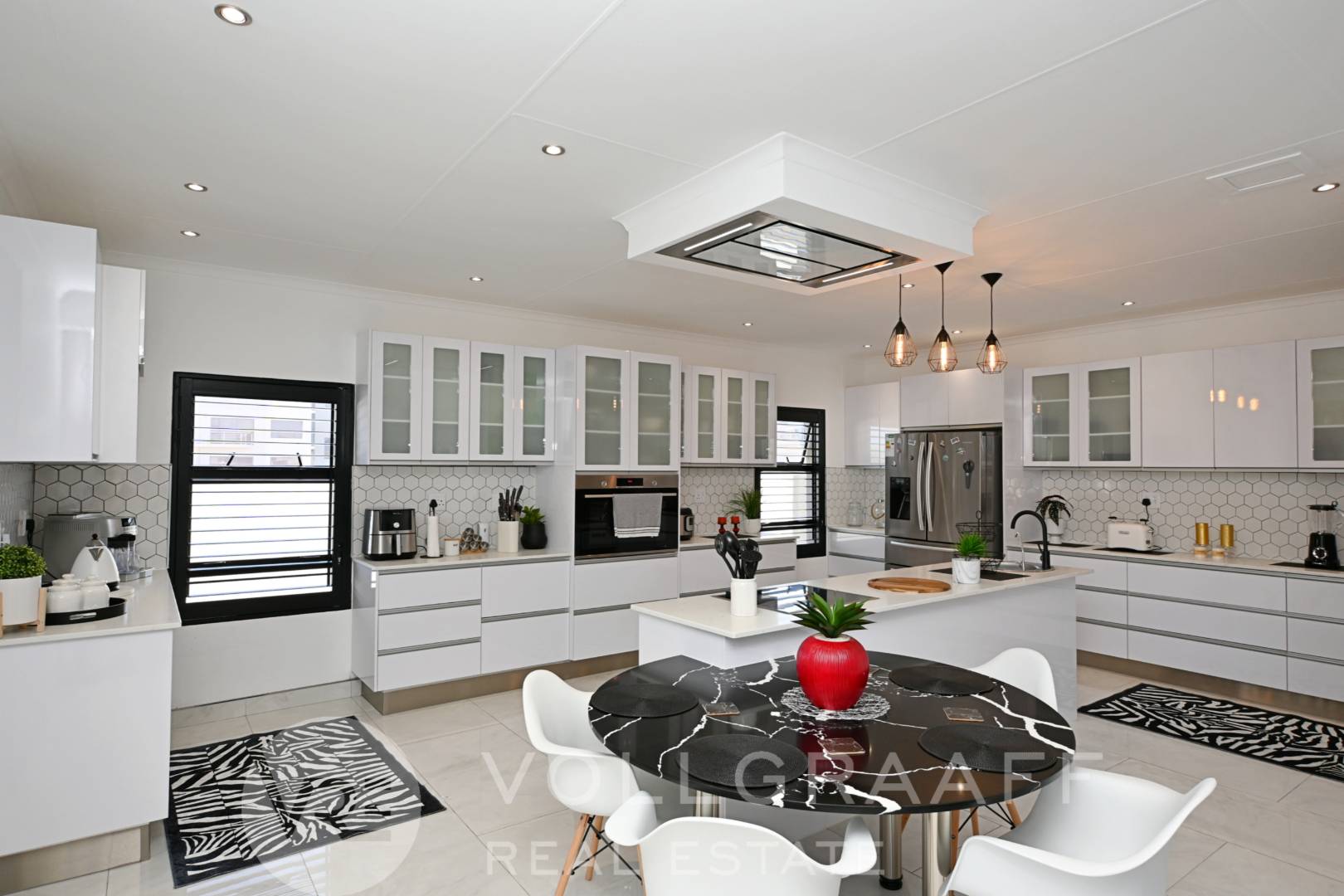 The kitchen is beautifully finished and well-equipped, with a central breakfast island, gas stove with remote extractor fan, eye-level oven, and matte black security blinds. A scullery and separate laundry area provide additional convenience.