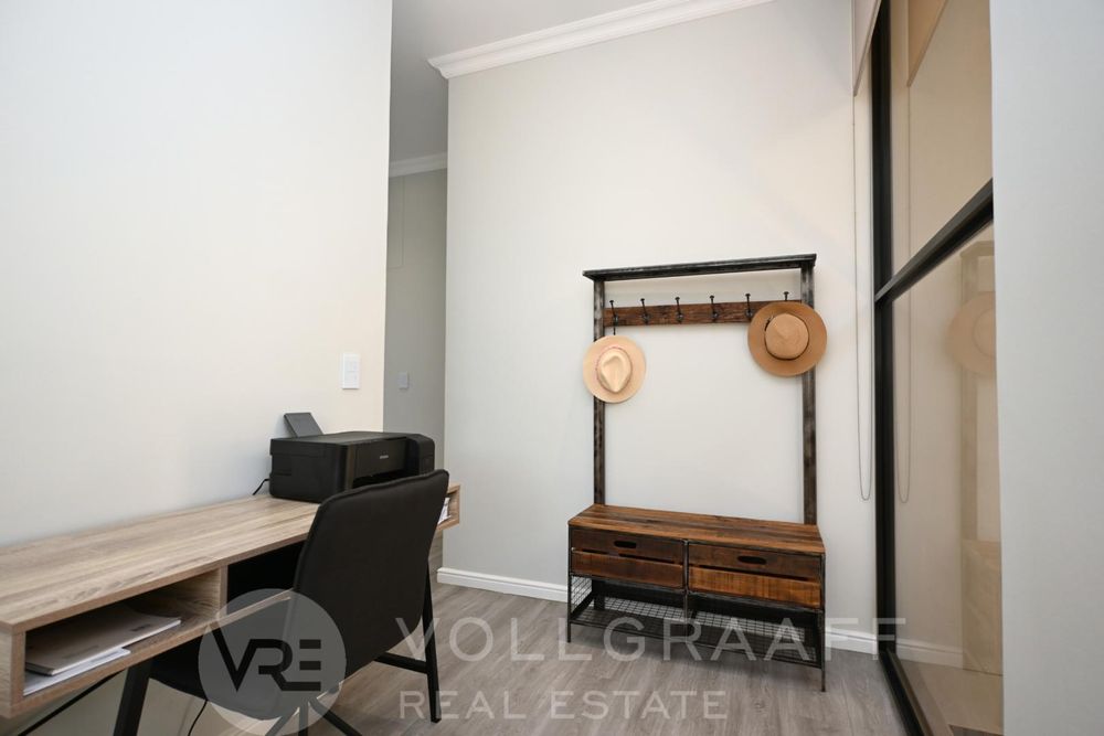The home welcomes you into open living space where the kitchen, and lounge areas connect naturally. The kitchen is fitted with granite countertops and flows effortlessly into the main living area, creating a comfortable space for everyday living and easy entertaining. A built-in braai forms part of the living area, while stack-away sliding doors open onto a private courtyard with a pergola and a neat lawn area — perfect for enjoying Swakopmund’s fresh coastal air.