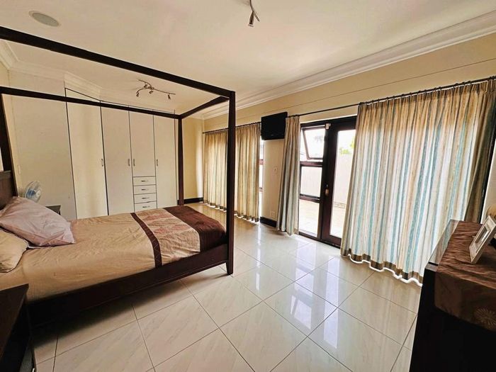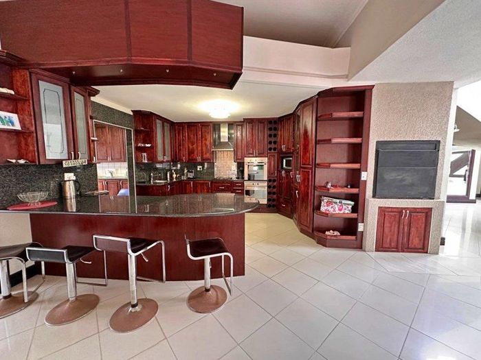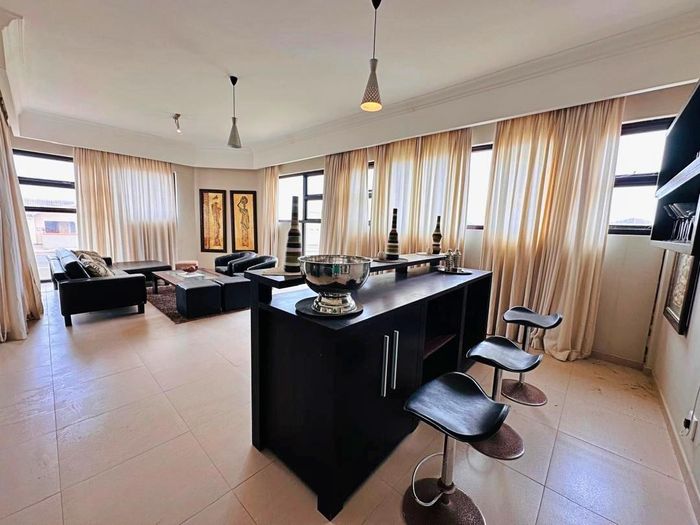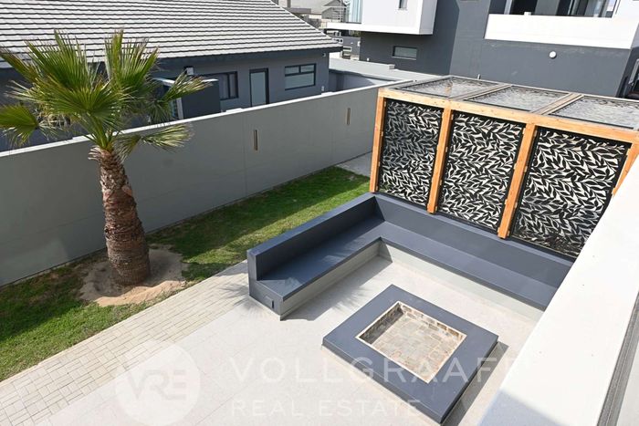 Coastal entertainer’s retreat, short walk from Platz Am Meer mall, with open-plan kitchen flowing to patio and lush garden, rooftop braai room with views; four bedrooms, four bathrooms, triple garage.