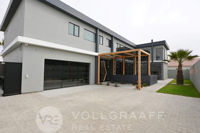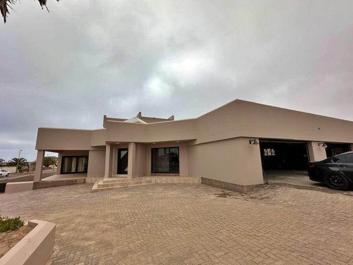 Coastal living in Swakopmund with endless ocean vistas and relaxed entertaining — expansive balcony and private ground-floor spa, large garden; five bedrooms, three bathrooms and three garages.