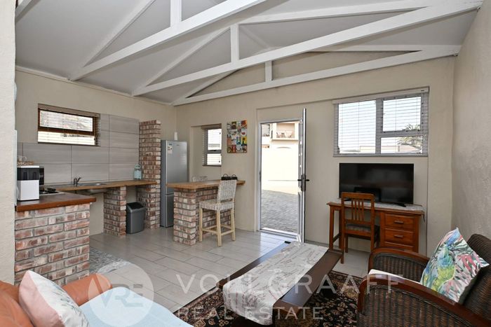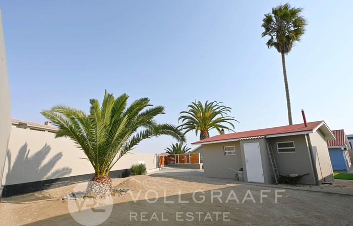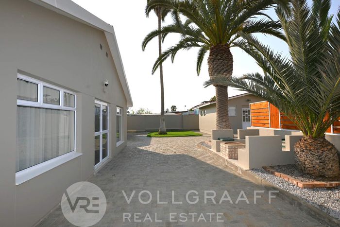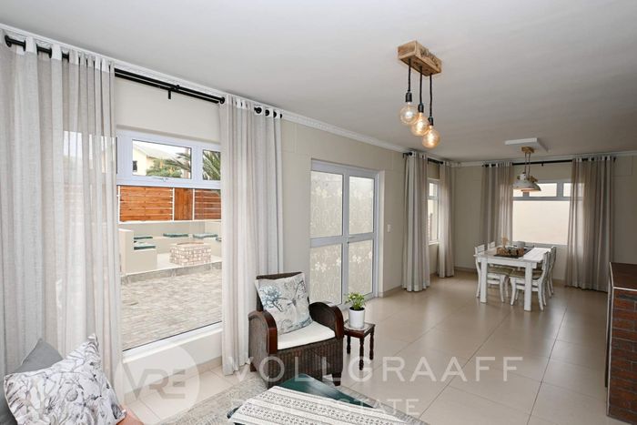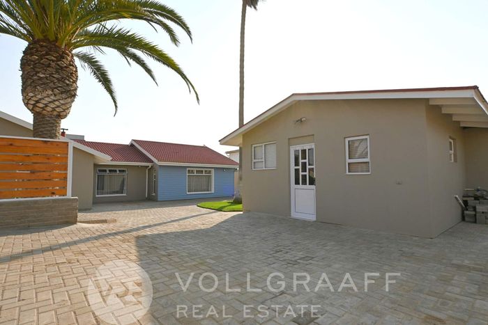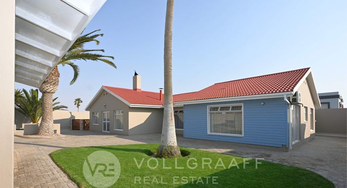 Coastal living in Swakopmund with endless ocean vistas and relaxed entertaining — expansive balcony and private ground-floor spa, large garden; five bedrooms, three bathrooms and three garages.