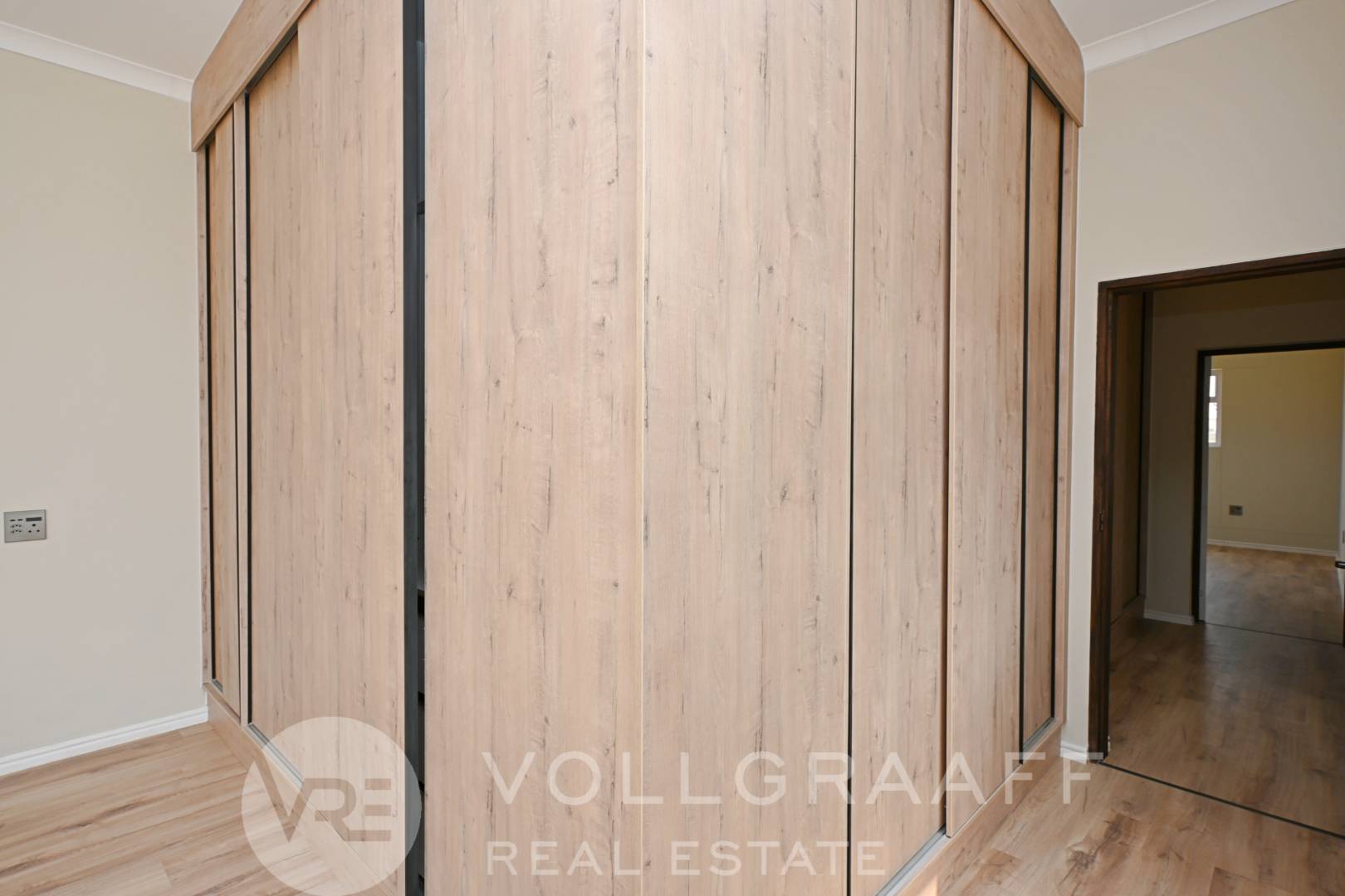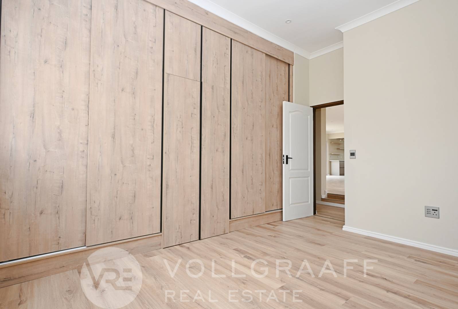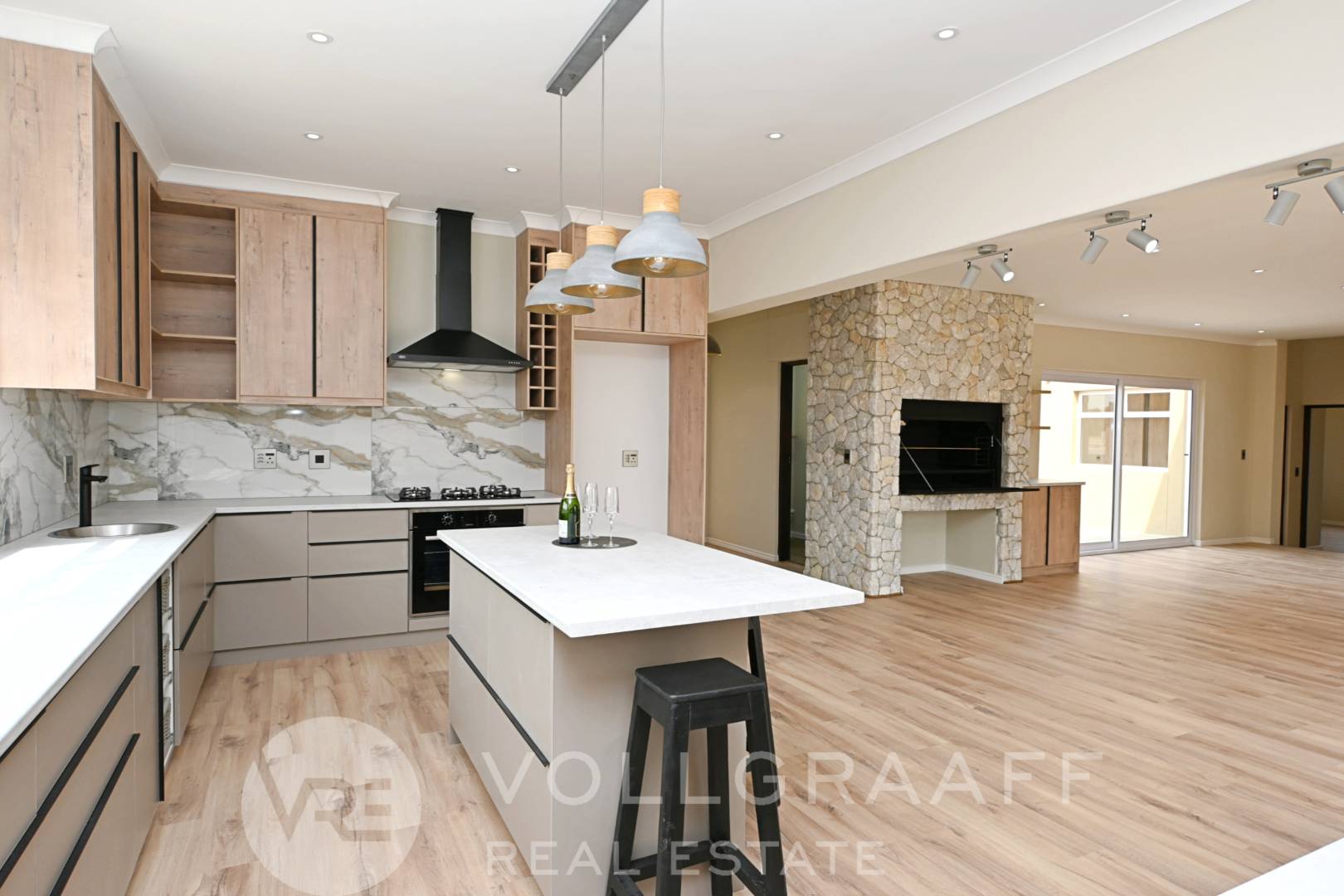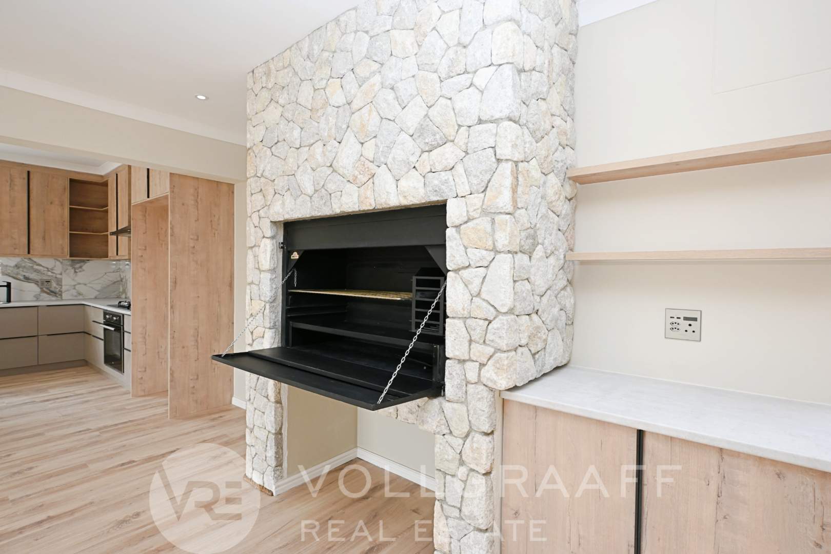 From the moment you enter, the open-plan living and dining area draws you in with its natural light and warm, welcoming atmosphere. The heart of the home — a beautifully finished kitchen with a central island and separate scullery — is designed for both everyday comfort and social gatherings. Just a few steps away, the striking stone-clad indoor braai creates a cozy hub, perfect for evenings shared with family and friends.
