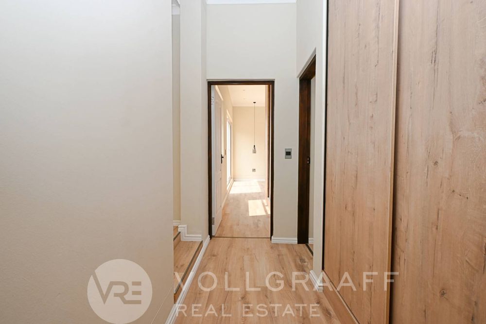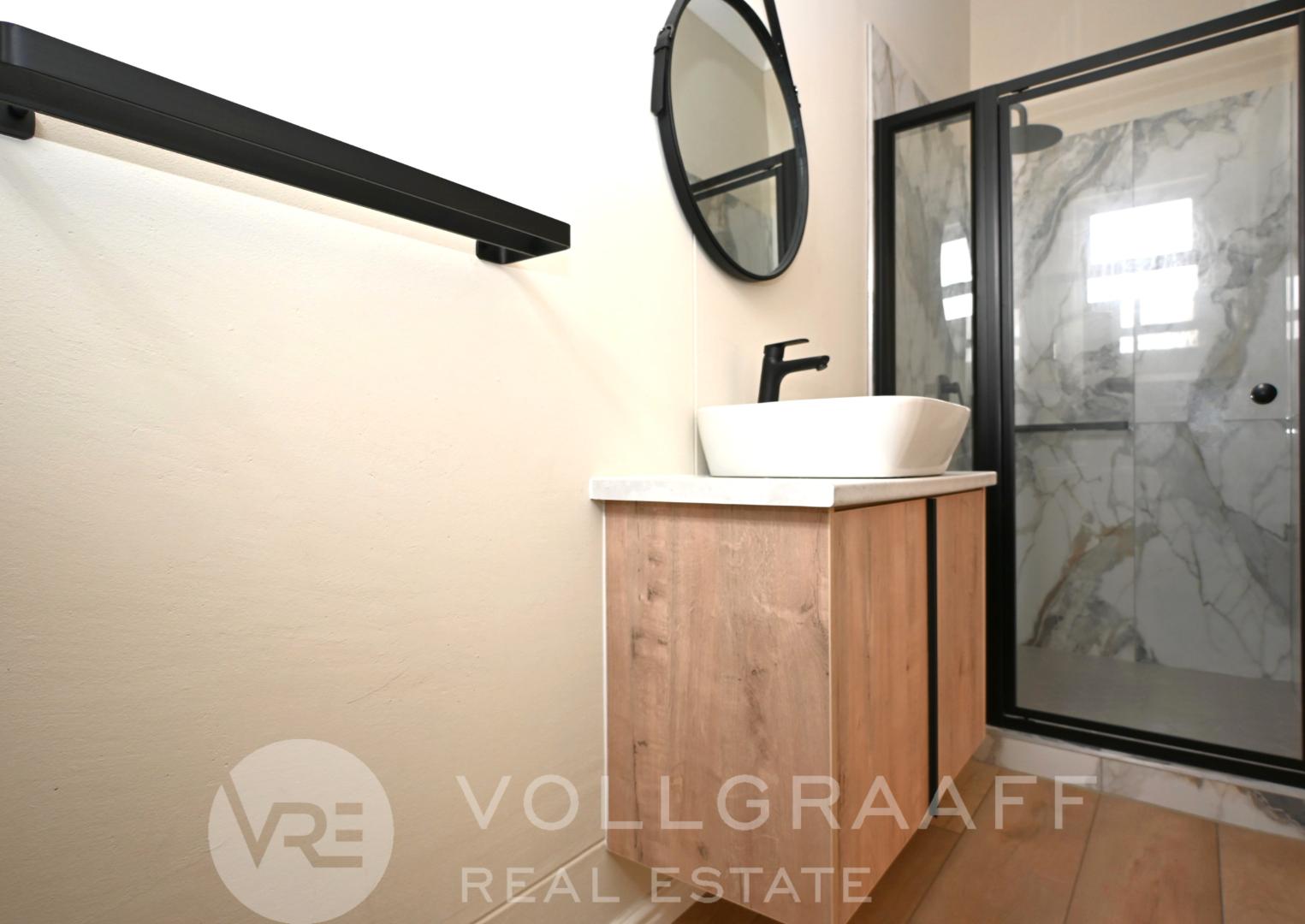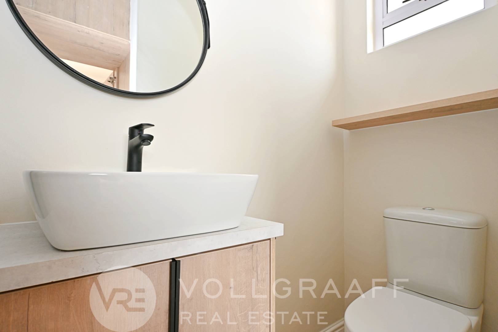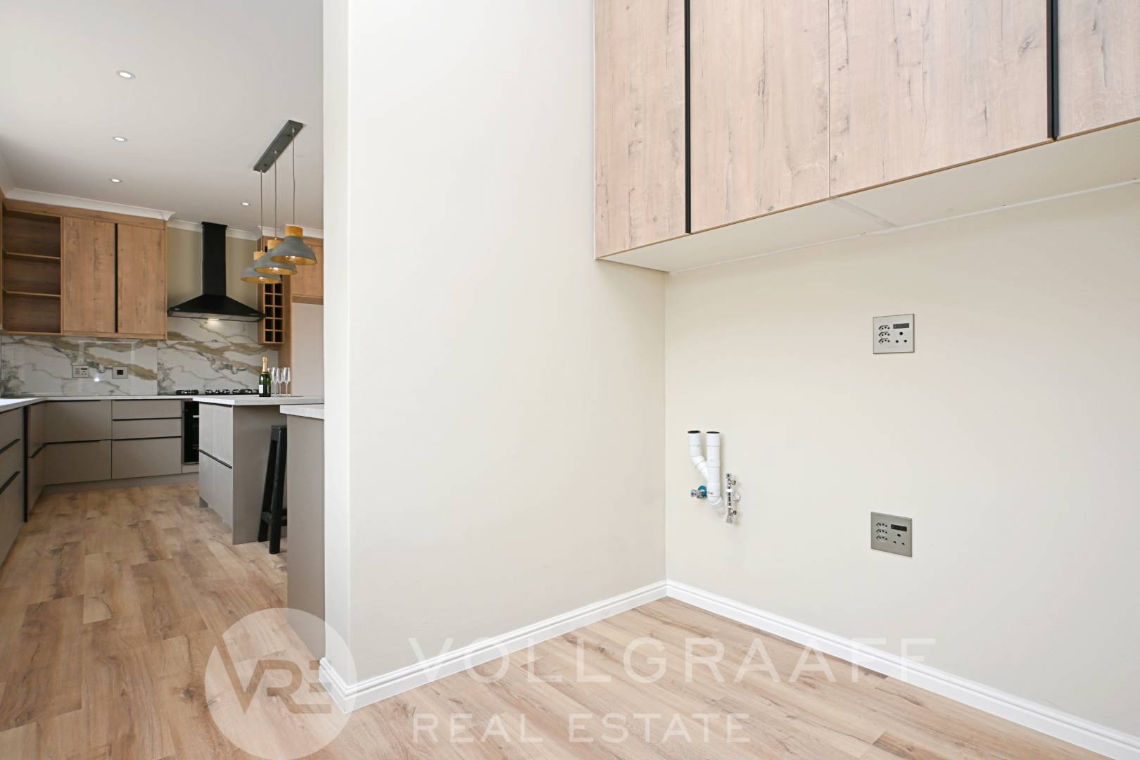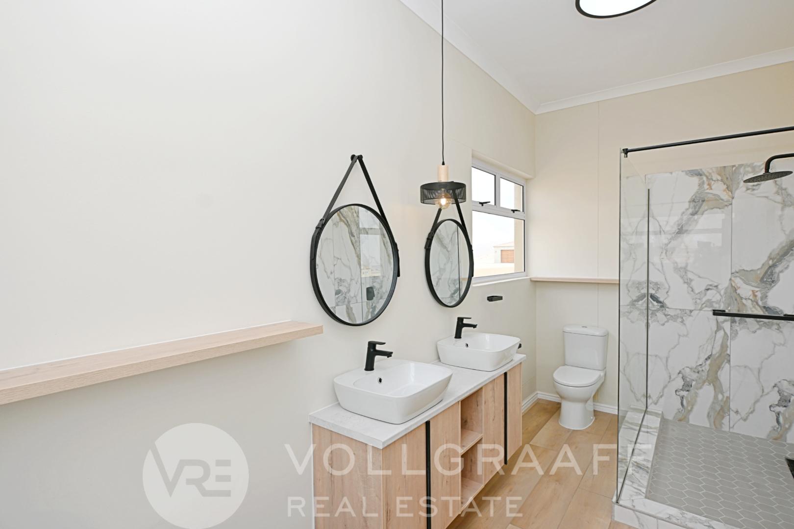 From the moment you enter, the open-plan living and dining area draws you in with its natural light and warm, welcoming atmosphere. The heart of the home — a beautifully finished kitchen with a central island and separate scullery — is designed for both everyday comfort and social gatherings. Just a few steps away, the striking stone-clad indoor braai creates a cozy hub, perfect for evenings shared with family and friends.