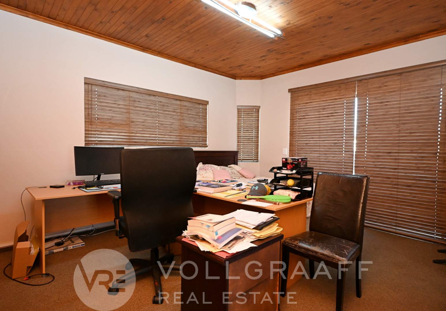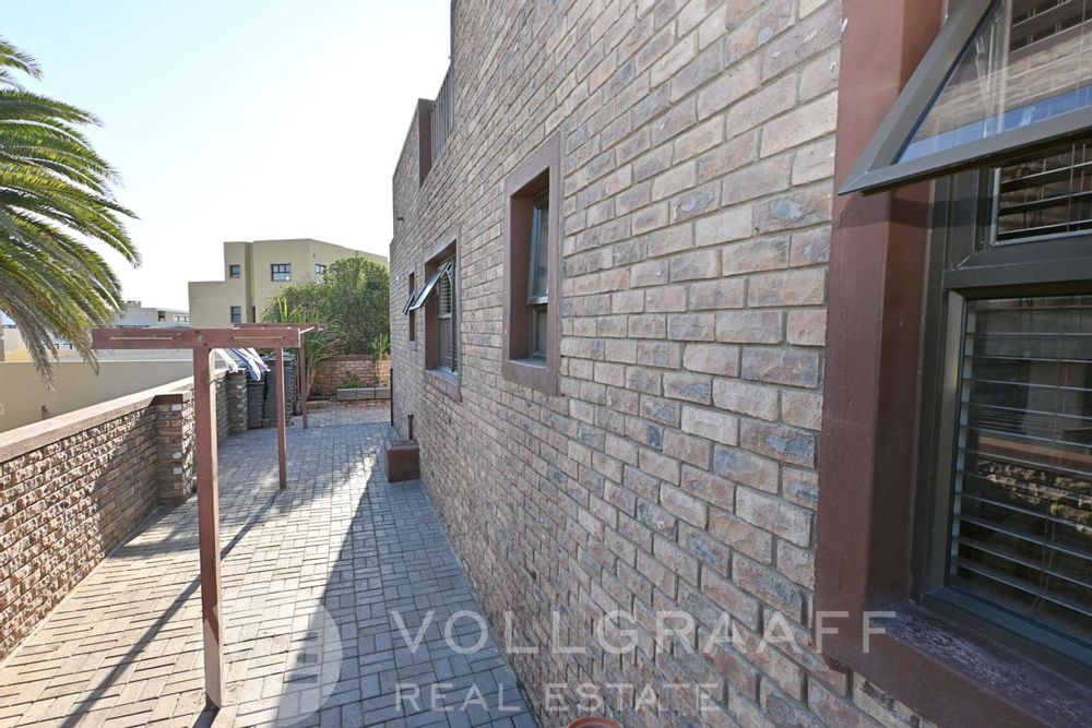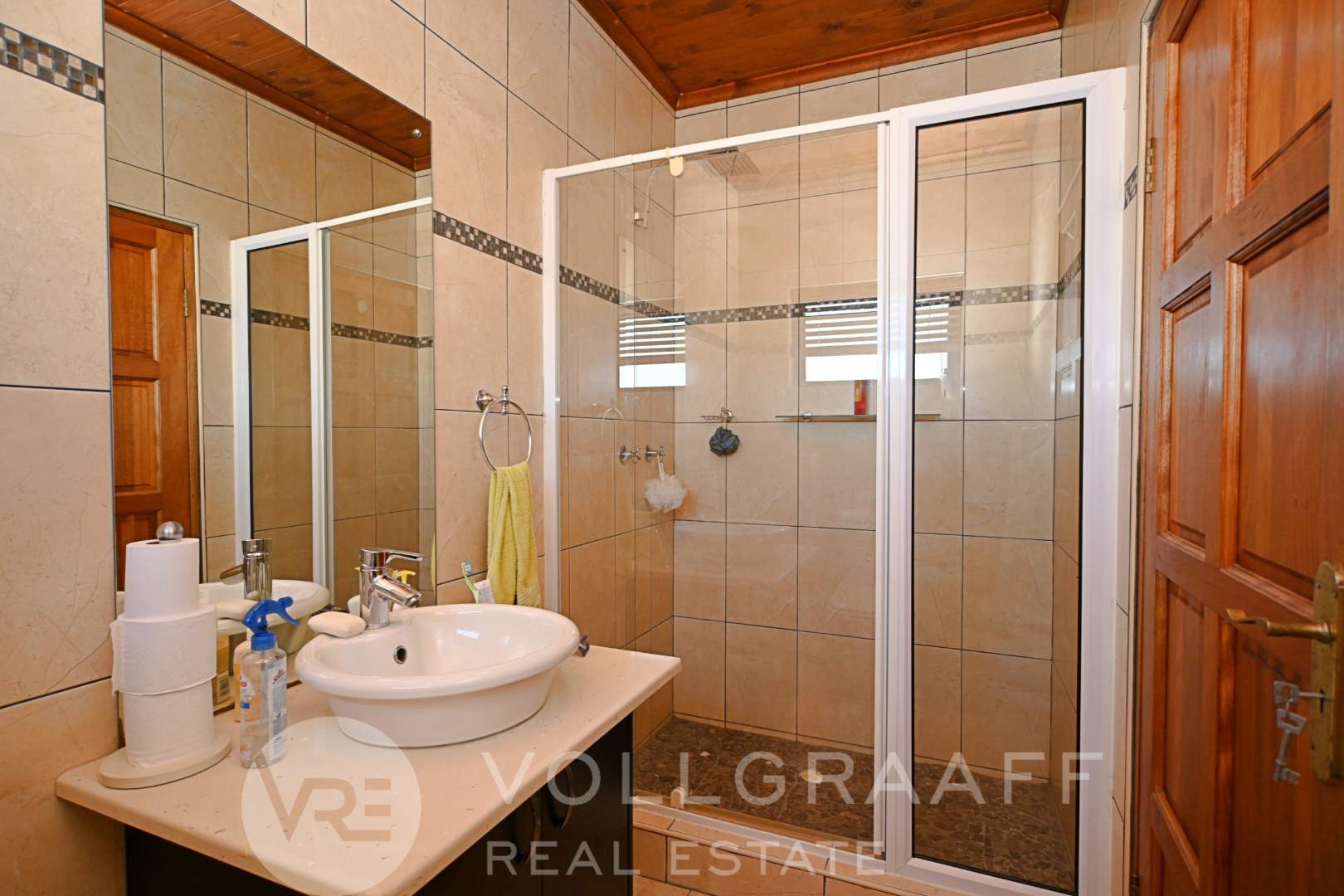 Upstairs, the home boasts five rooms in total: three bedrooms – all with en-suite bathrooms – and two additional rooms ideal for home offices or extra bedrooms. The main bedroom is exceptionally spacious with a full en-suite, ample built-in cupboards, and access to a private balcony shared with one other room. A second, very large balcony is accessible from two of the other rooms through glass sliding doors and offers a partial sea view, perfect for enjoying Swakopmund’s coastal air.