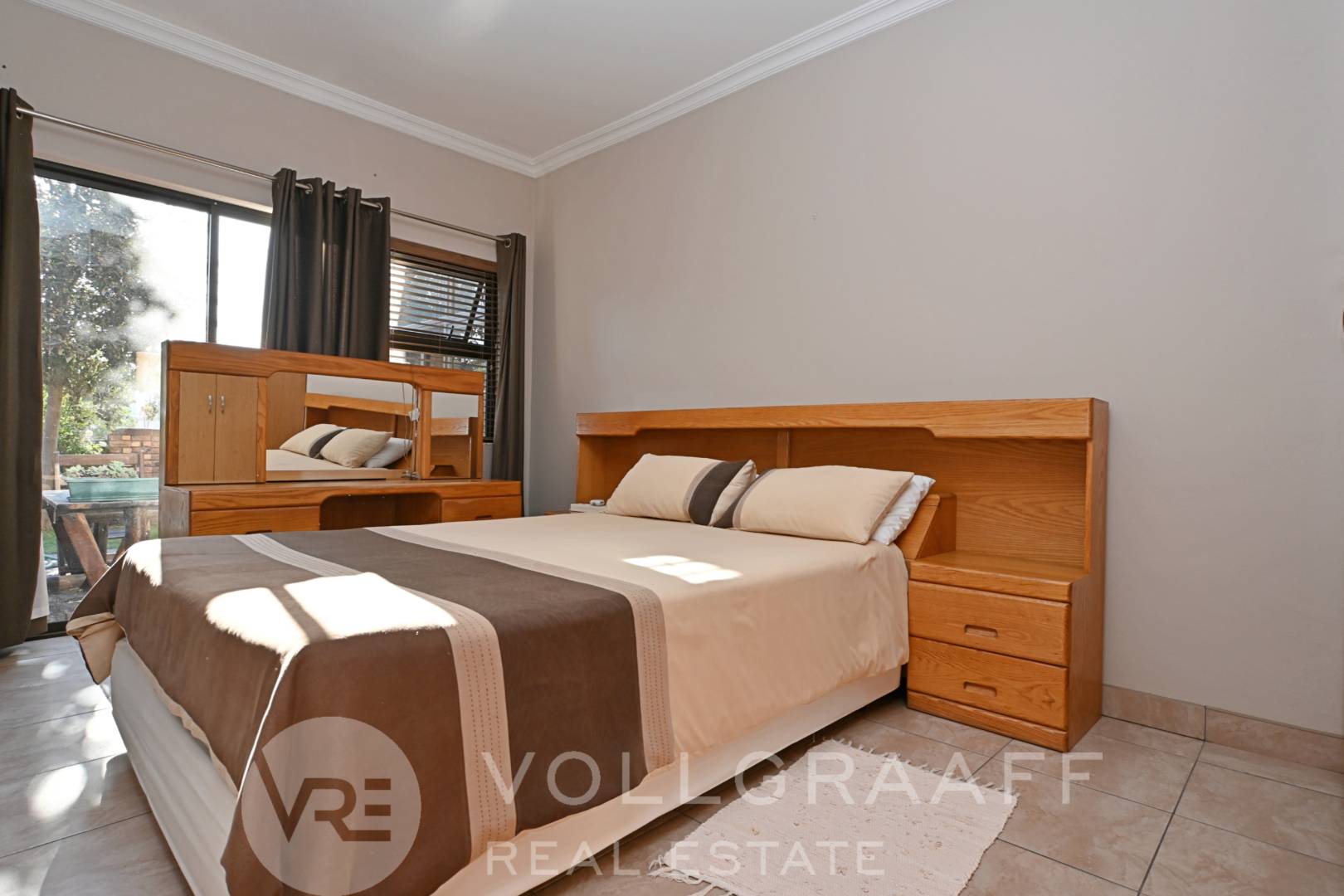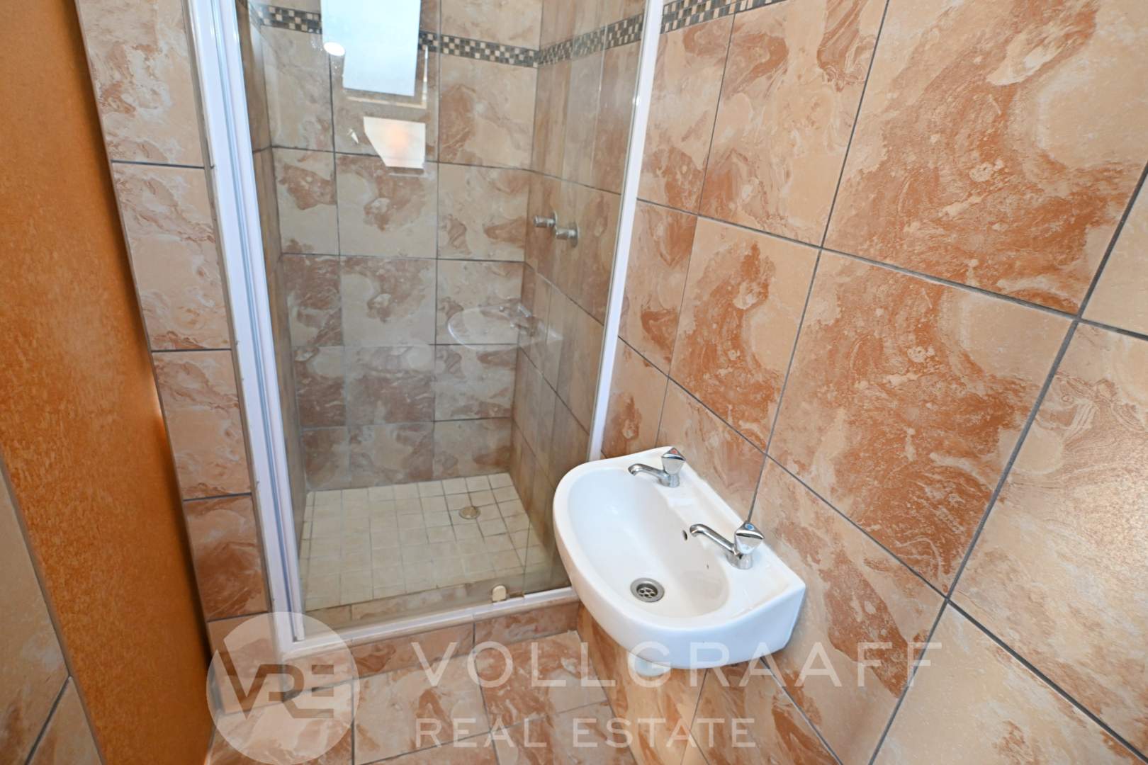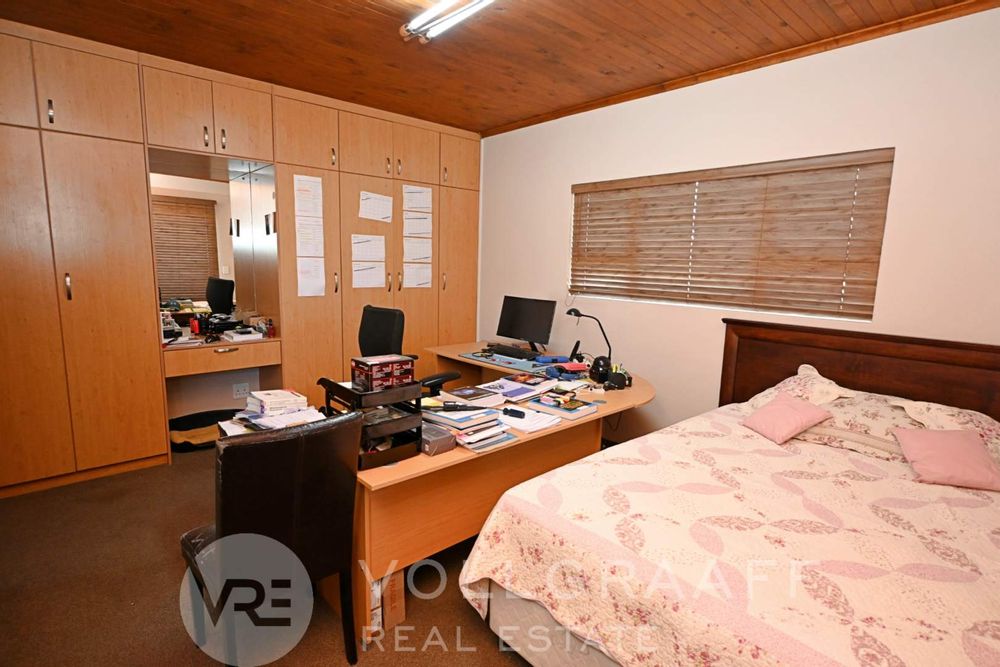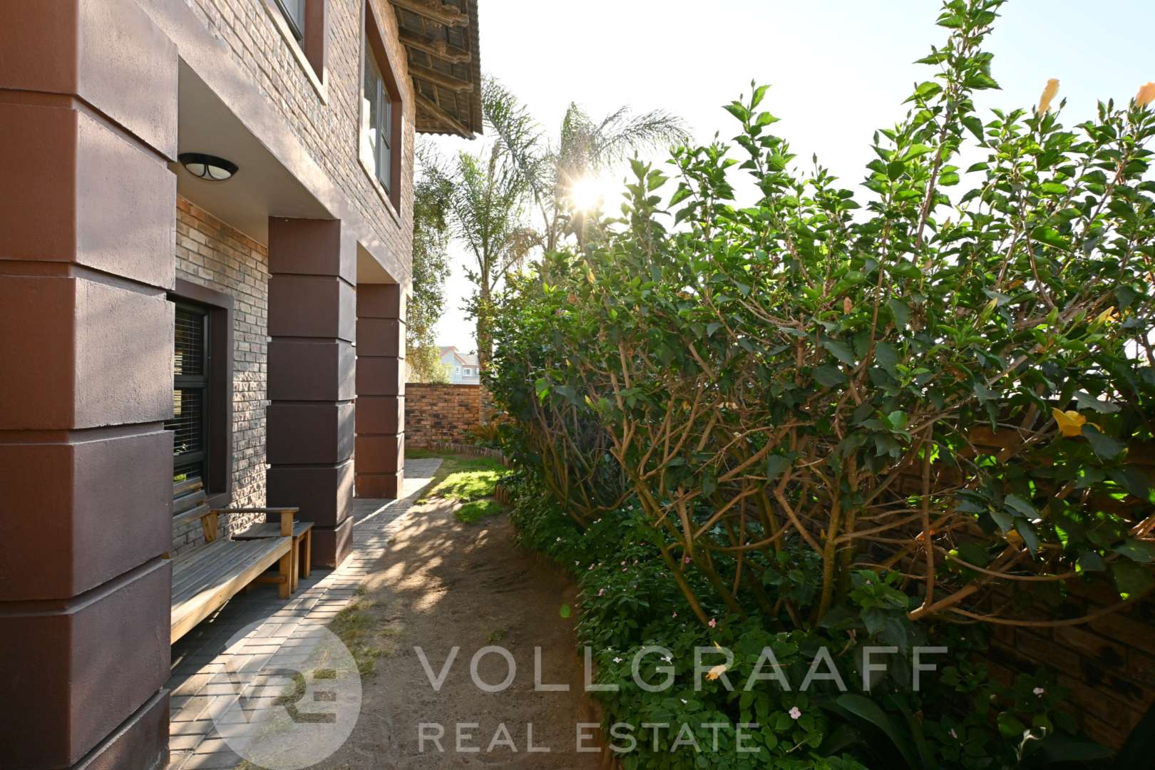 Upstairs, the home boasts five rooms in total: three bedrooms – all with en-suite bathrooms – and two additional rooms ideal for home offices or extra bedrooms. The main bedroom is exceptionally spacious with a full en-suite, ample built-in cupboards, and access to a private balcony shared with one other room. A second, very large balcony is accessible from two of the other rooms through glass sliding doors and offers a partial sea view, perfect for enjoying Swakopmund’s coastal air.