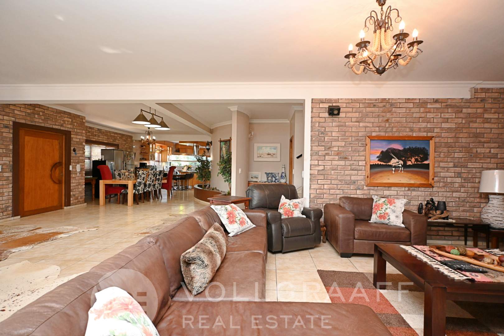 Downstairs features two generous lounge areas, two dining areas, a spacious kitchen with a walk-in pantry, and a separate scullery. The laundry area is accessed directly through the one double garage, and an indoor braai room opens to the garden via glass sliding doors – perfect for entertaining in any season.