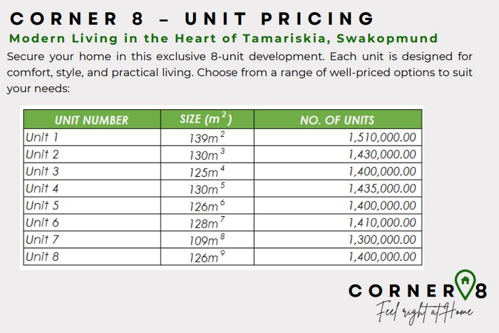 Introducing SwakopMint, a fresh and exciting new development offering the perfect blend of modern design and coastal living. This exclusive complex will consist of 15 single-story units, available in three different types: Type A, Type B, and Type C. Each unit is designed with practicality and style in mind, ensuring comfort and convenience for all residents.