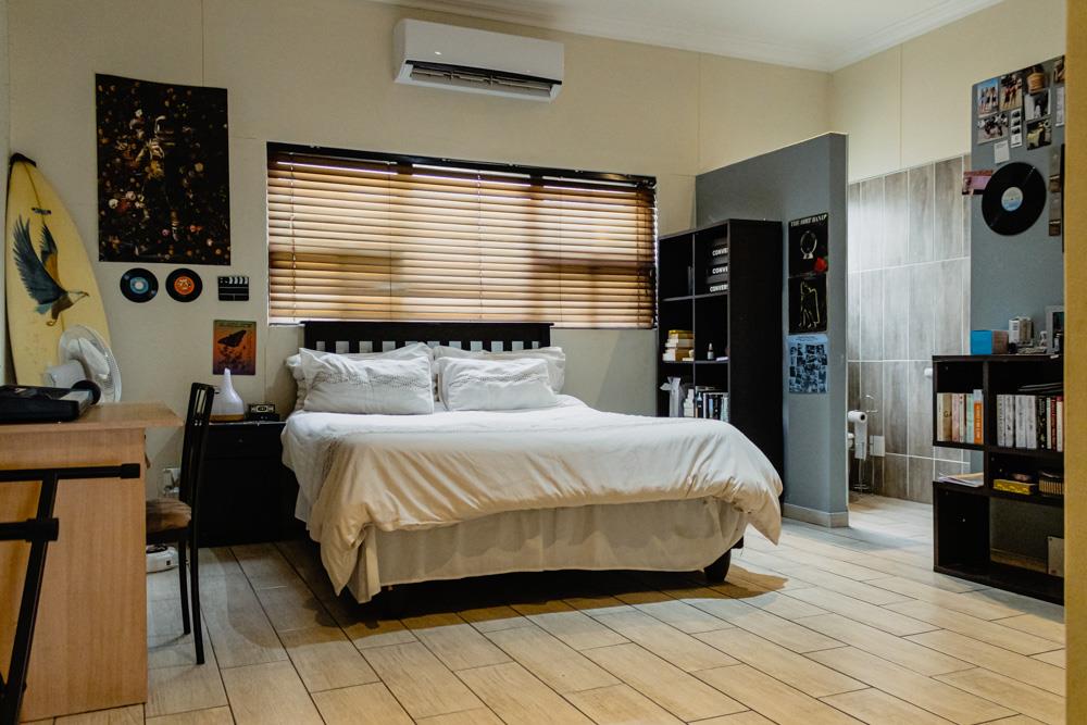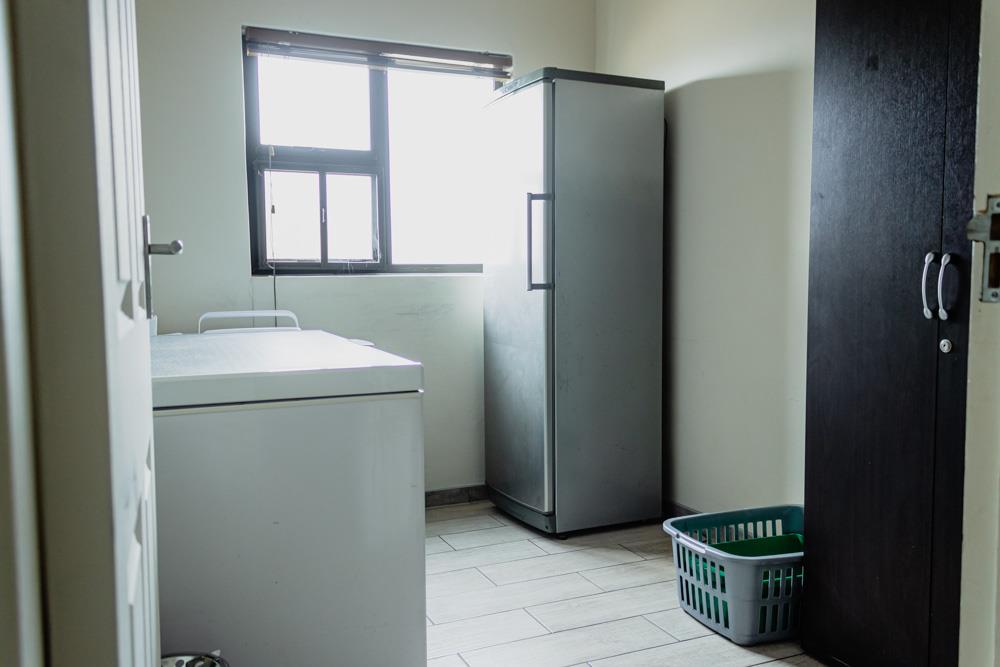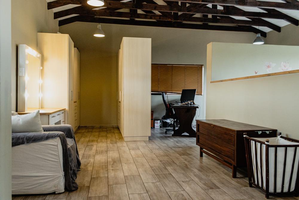 The property features a substantial garage with four automated doors. An inviting thatched-roof entertainment area seamlessly blends indoor and outdoor spaces and is complemented by a swimming pool, perfect for relaxation and social gatherings.
