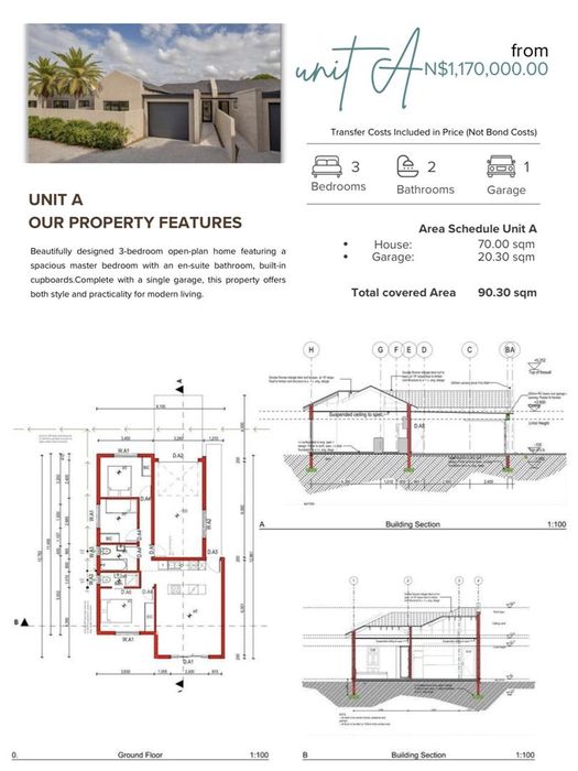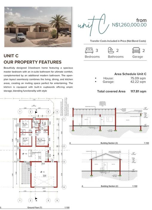 Unit A — Contemporary Turnstone residence in Tamariskia, Swakopmund — open-plan living with a roomy master en-suite and built-in cupboards, plus single garage for low-maintenance coastal living.Unit B — Spacious Turnstone home in Tamariskia with a stylish kitchen and master en-suite, double garage for extra storage/security — ideal for families seeking modern, secure coastal living.Unit C — New Turnstone townhouse in Tamariskia featuring integrated open-plan living, dining and kitchen with modern finishes and built-in cupboards, plus a double garage for convenient Swakopmund living.
