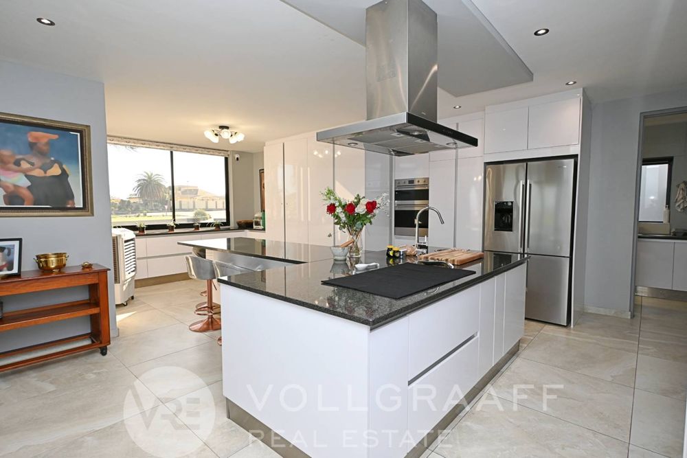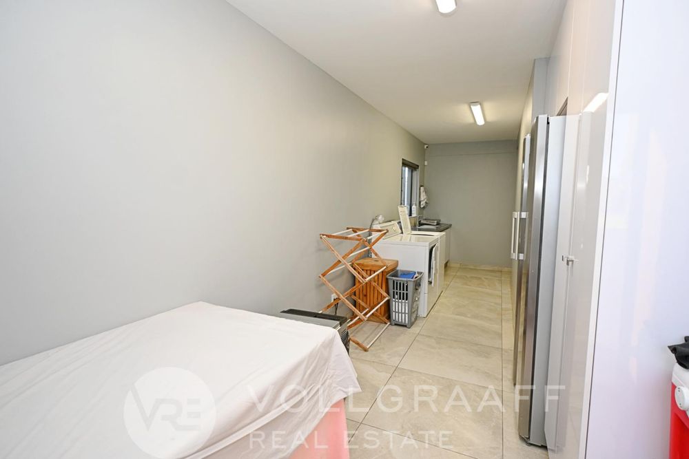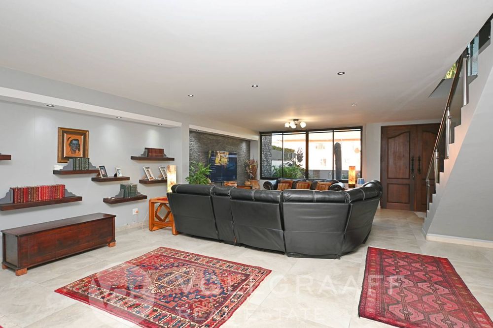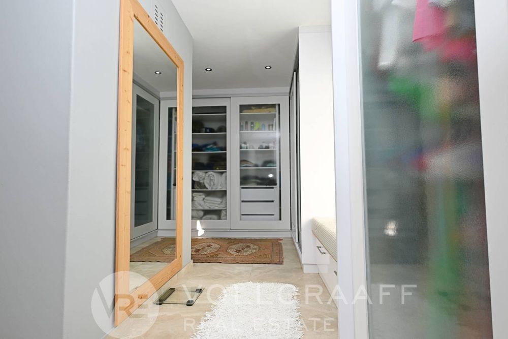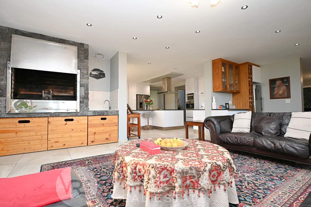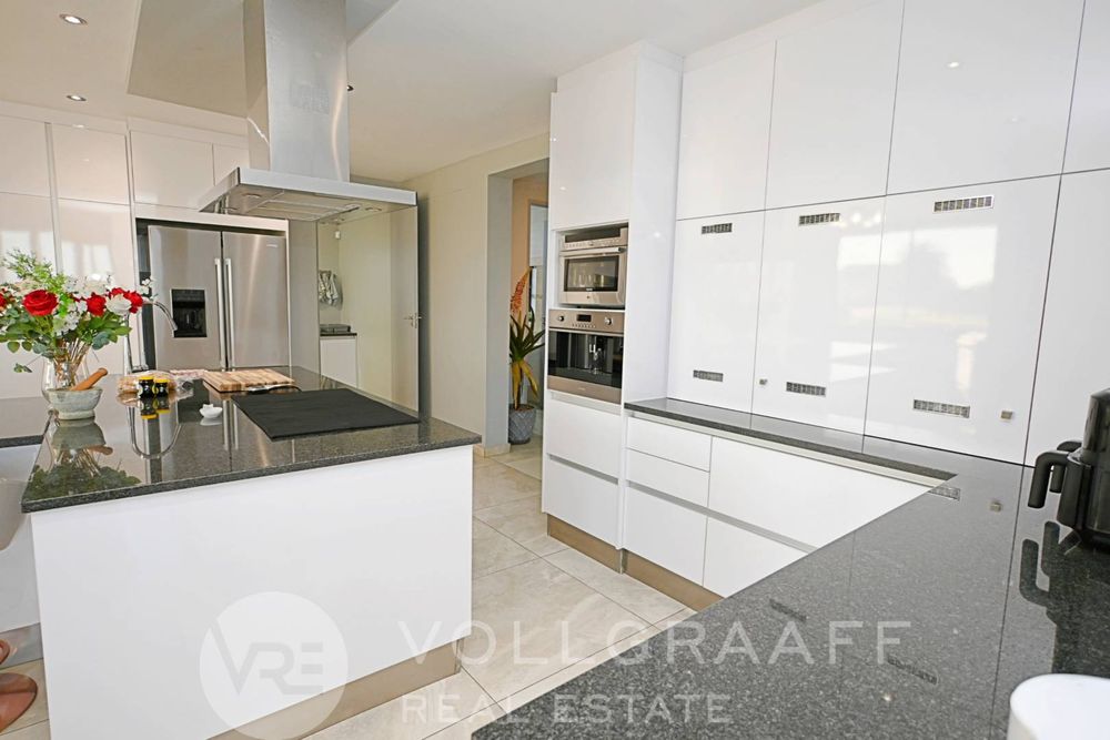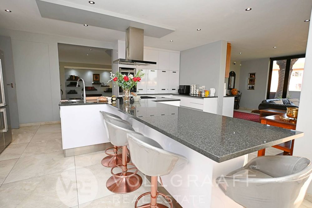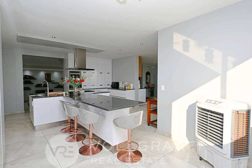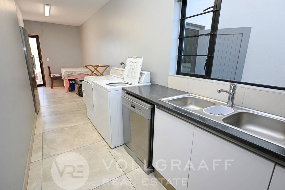 The main house boasts two expansive living areas, perfect for entertaining and relaxation. A modern, state-of-the-art kitchen equipped with high-end appliances, soft-close cupboards with integrated LED lighting, and a convenient scullery. There is also a convenient guest loo located downstairs.