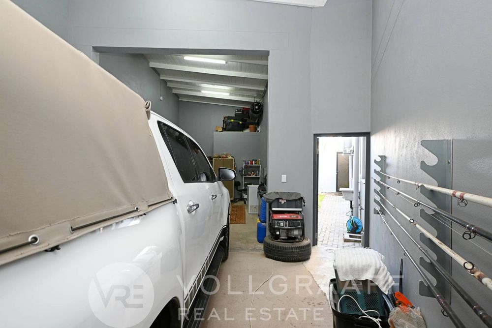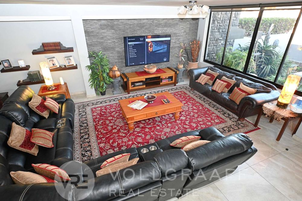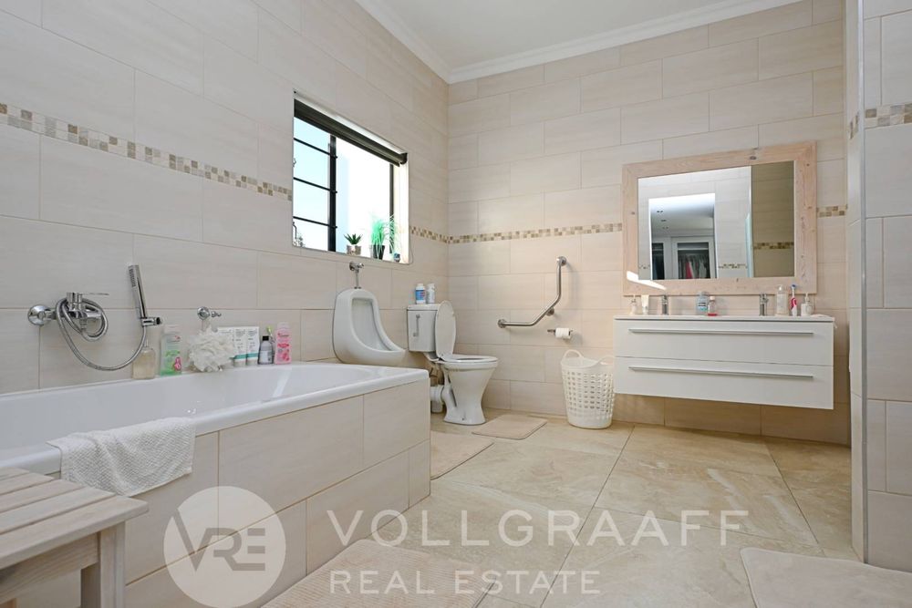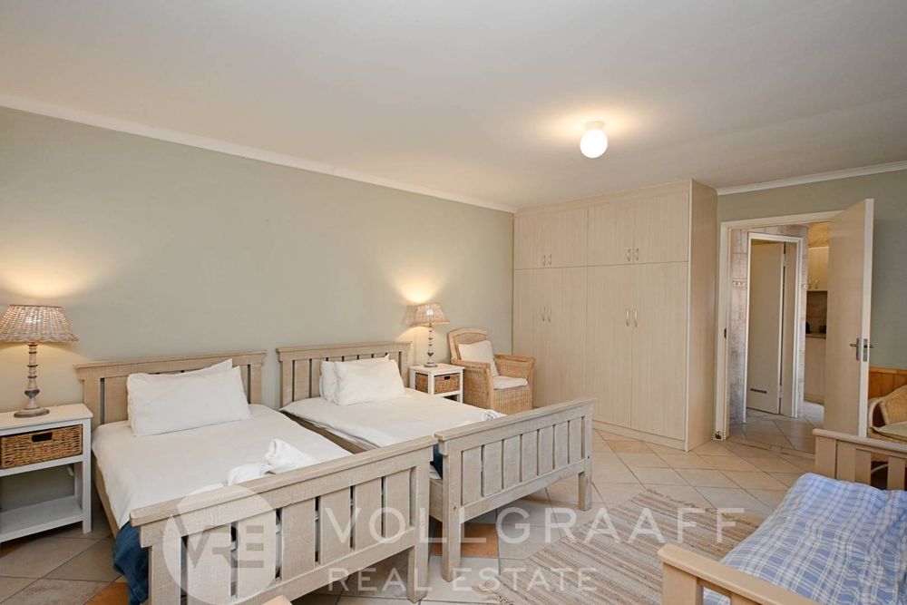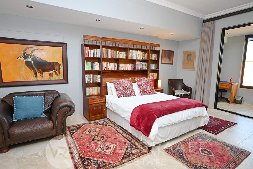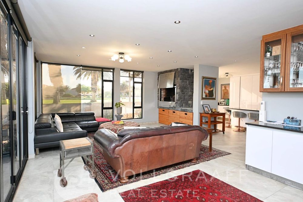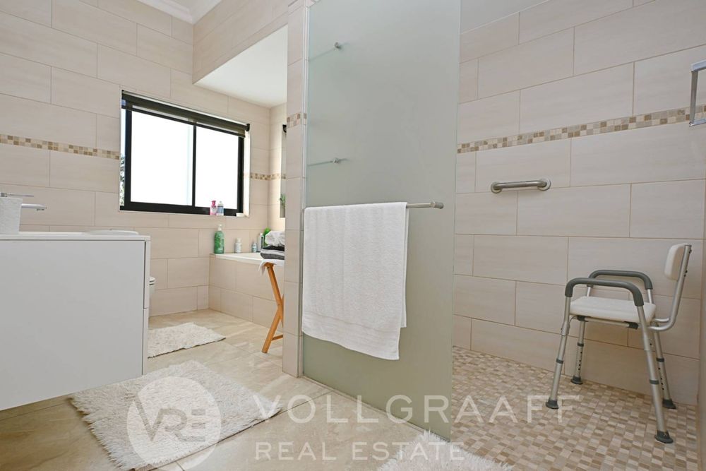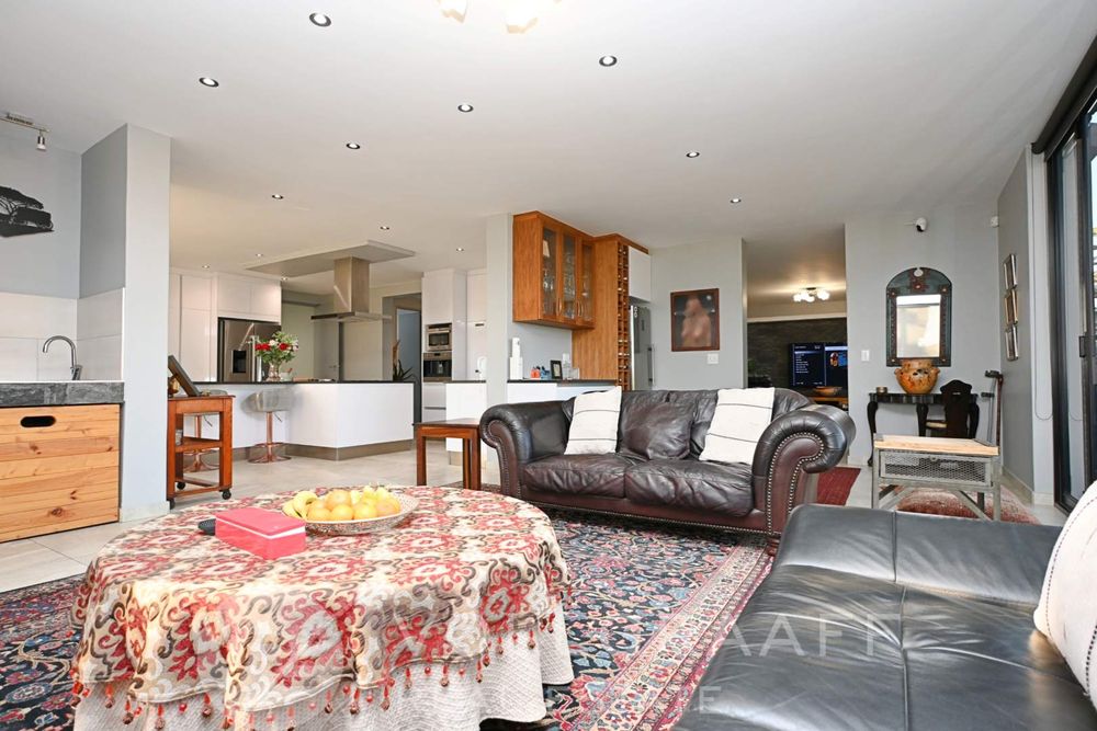 The main house boasts two expansive living areas, perfect for entertaining and relaxation. A modern, state-of-the-art kitchen equipped with high-end appliances, soft-close cupboards with integrated LED lighting, and a convenient scullery. There is also a convenient guest loo located downstairs.
