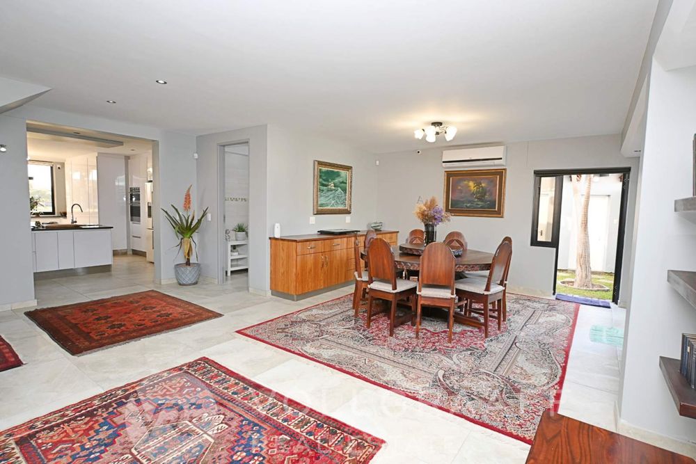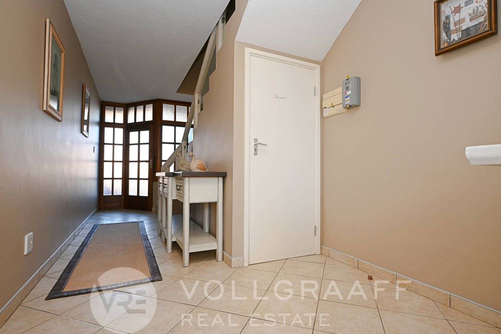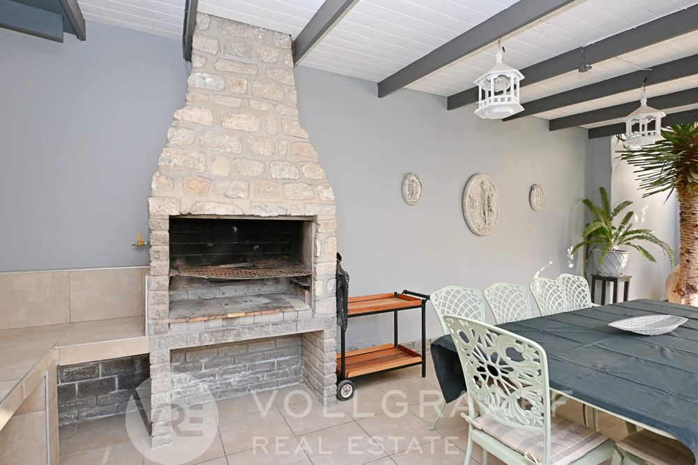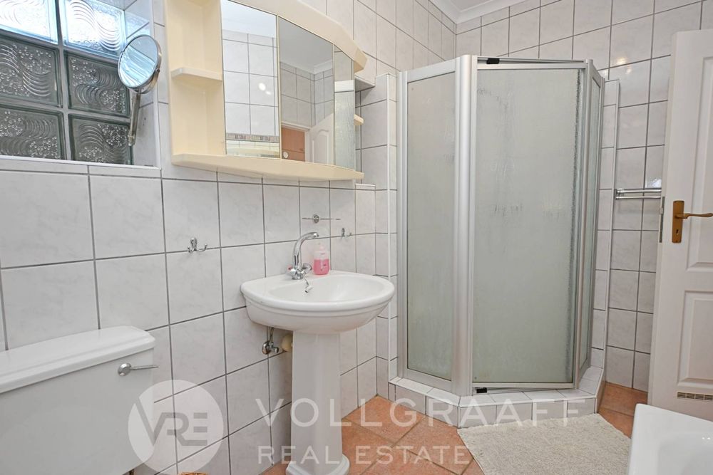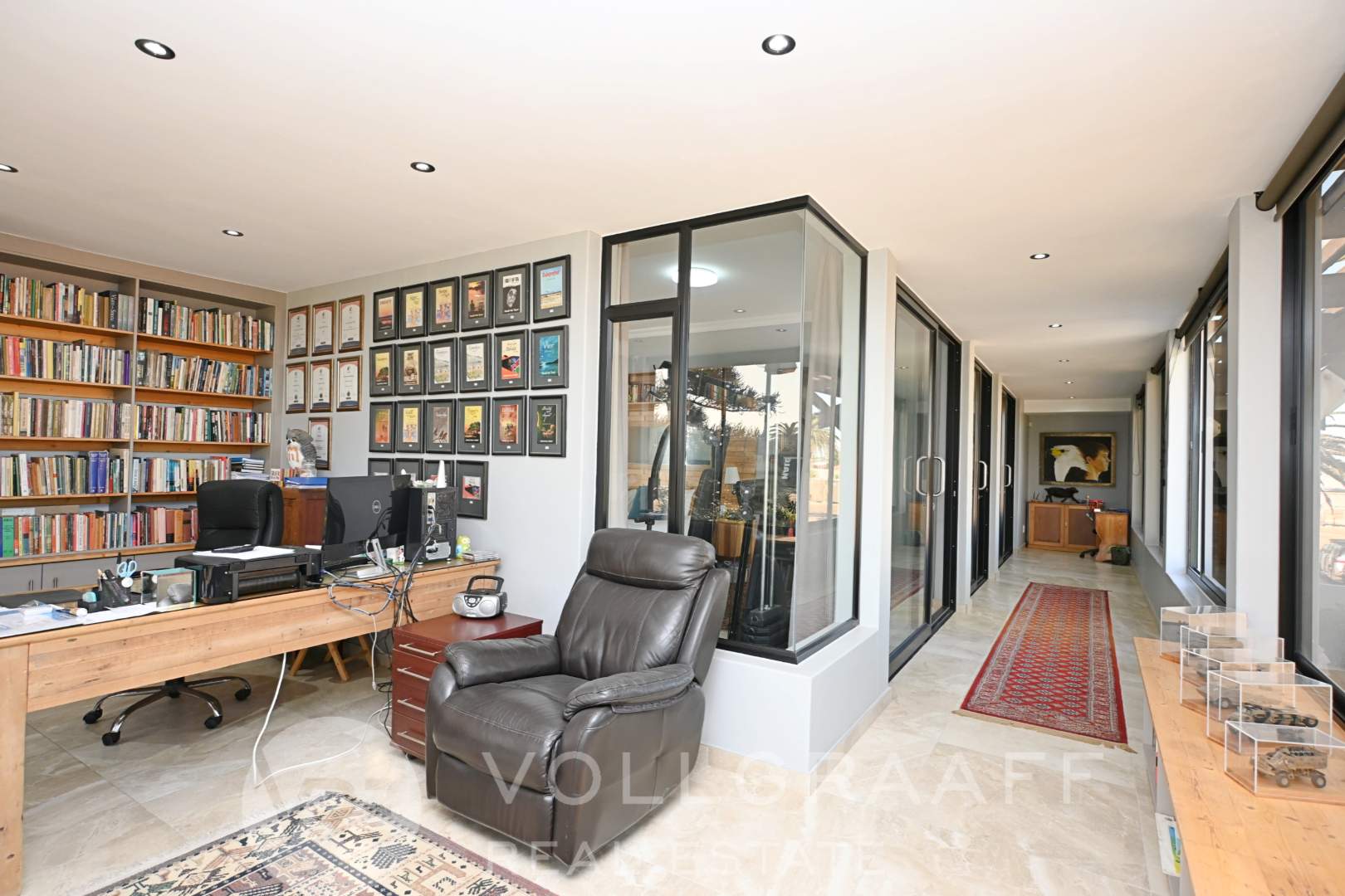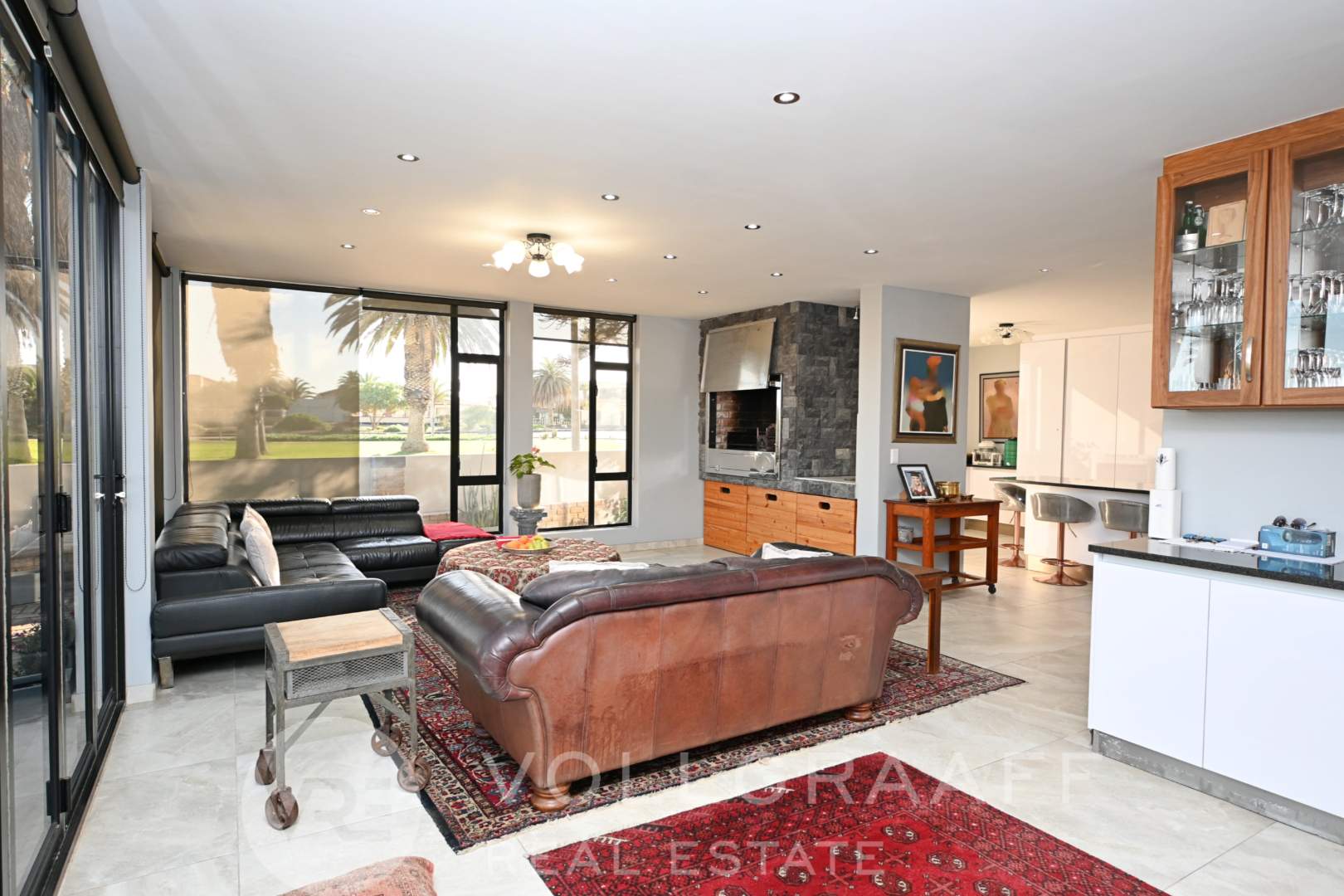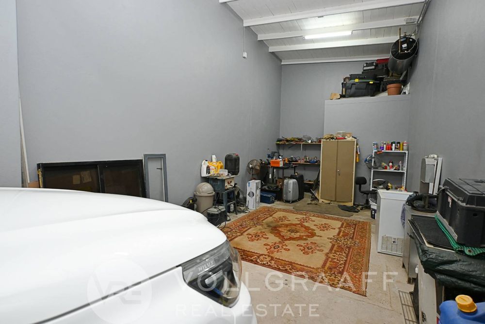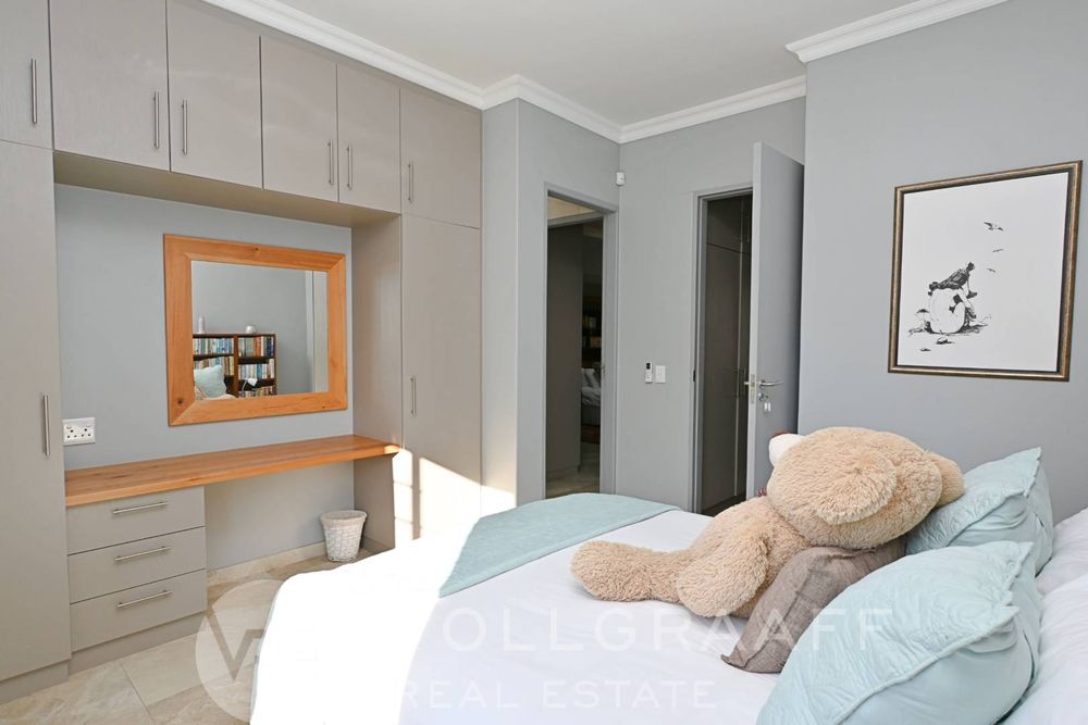 The main house boasts two expansive living areas, perfect for entertaining and relaxation. A modern, state-of-the-art kitchen equipped with high-end appliances, soft-close cupboards with integrated LED lighting, and a convenient scullery. There is also a convenient guest loo located downstairs.