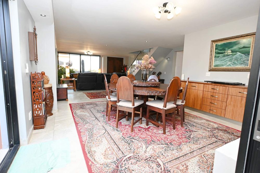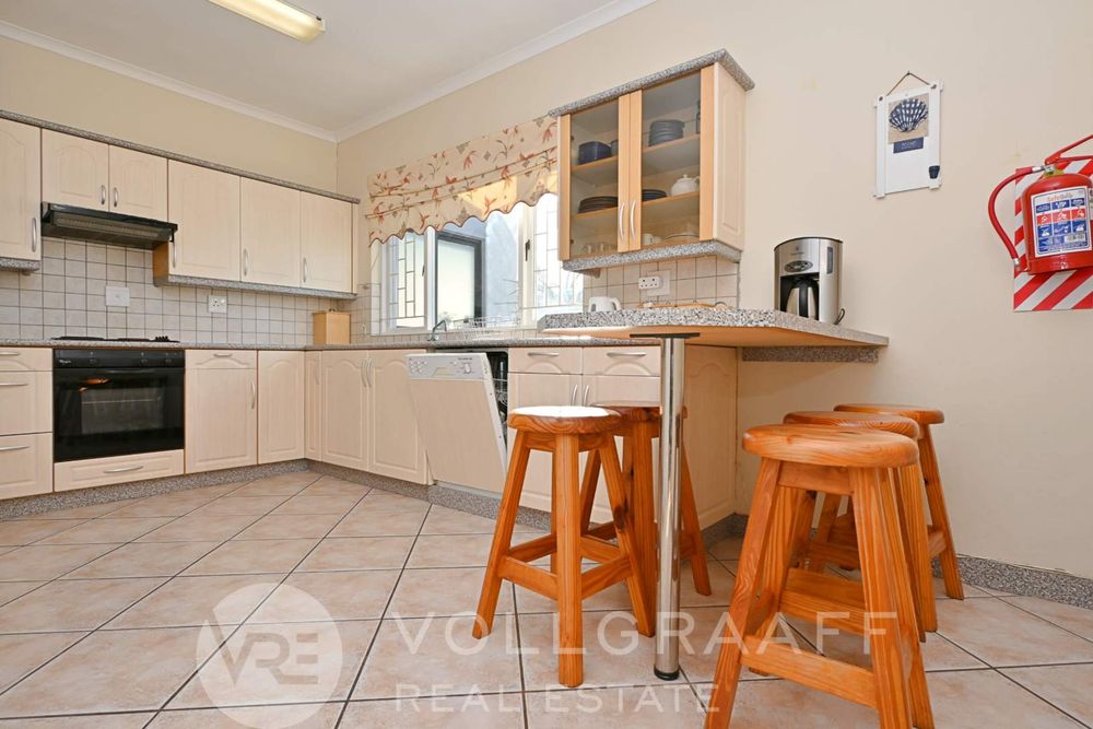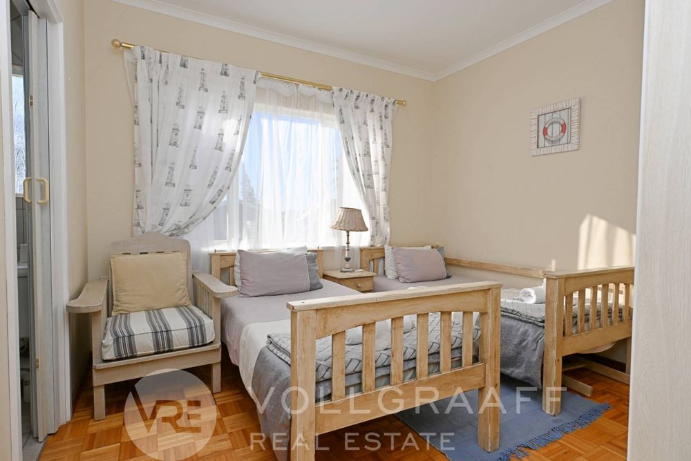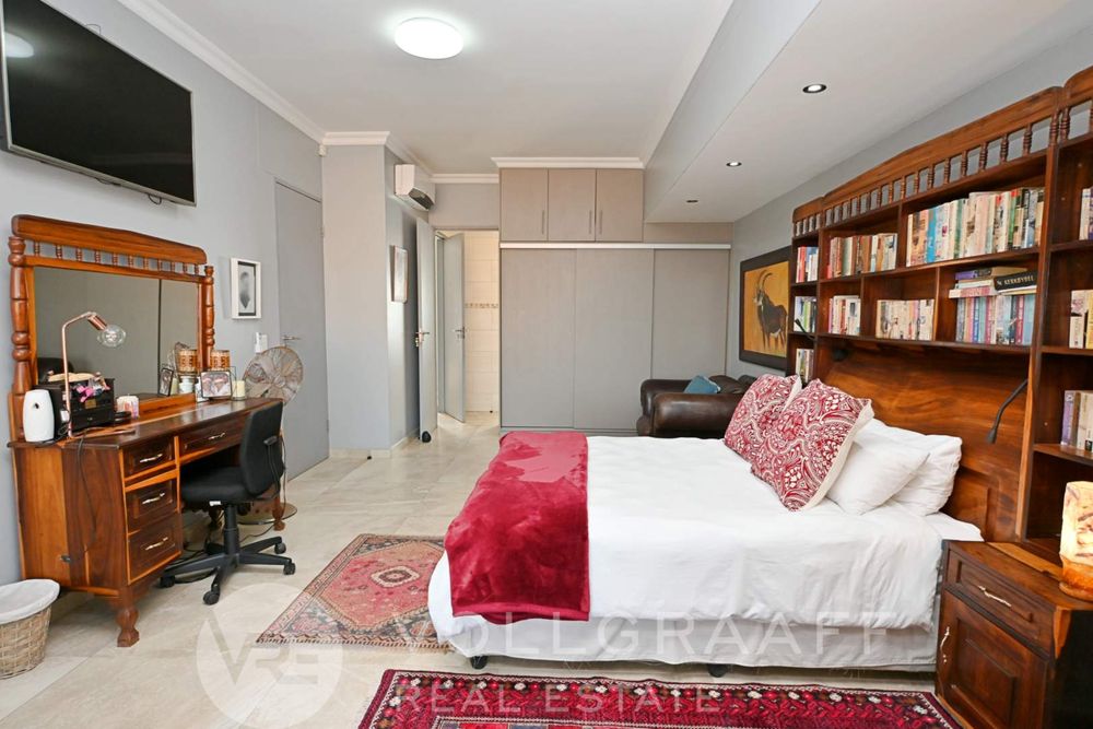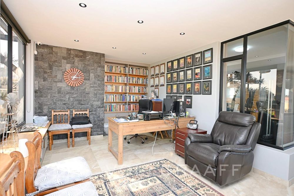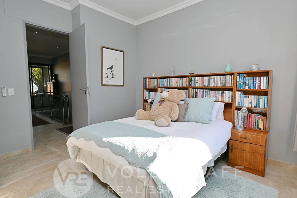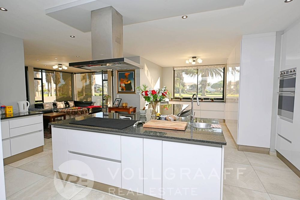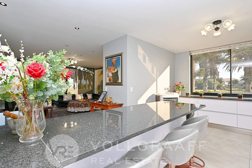 The main house boasts two expansive living areas, perfect for entertaining and relaxation. A modern, state-of-the-art kitchen equipped with high-end appliances, soft-close cupboards with integrated LED lighting, and a convenient scullery. There is also a convenient guest loo located downstairs.
