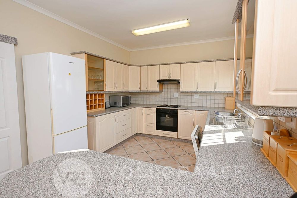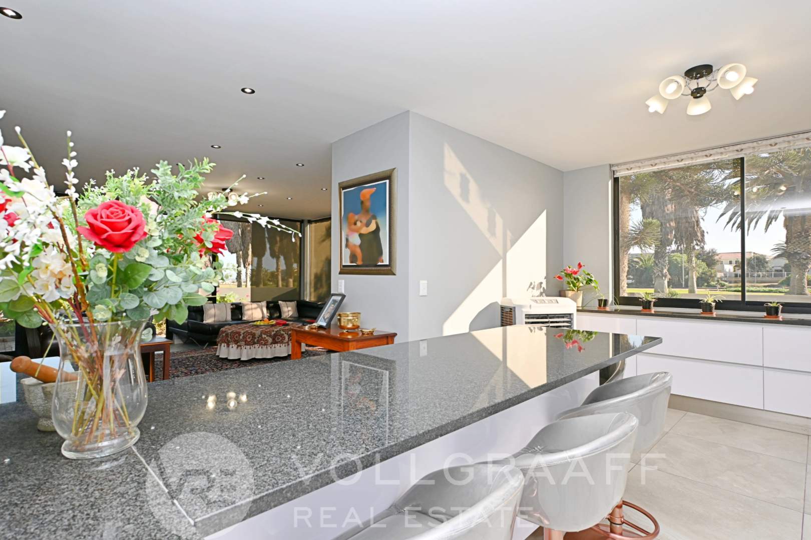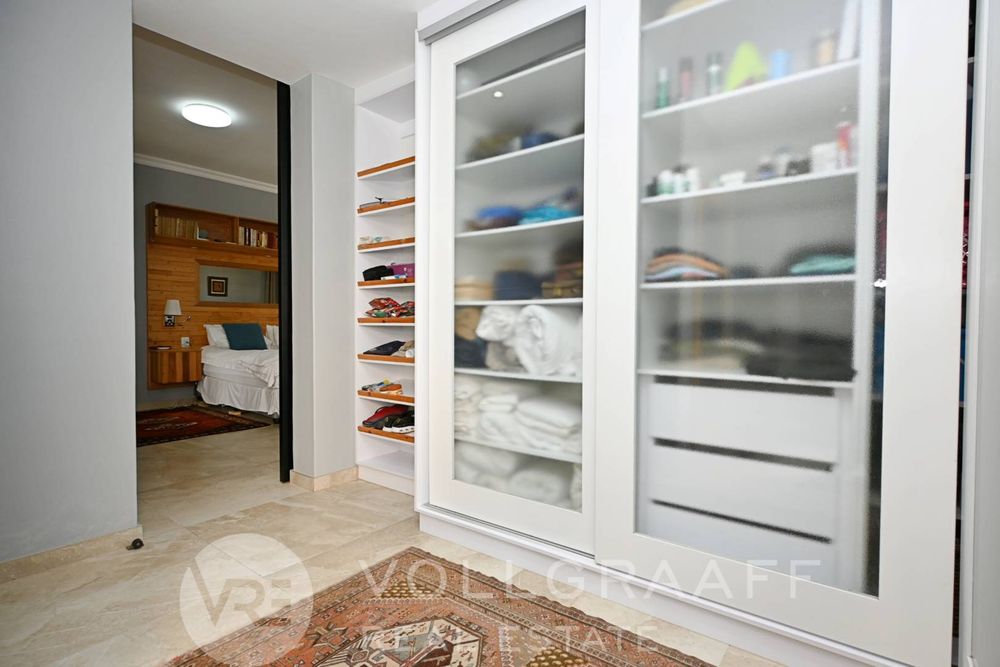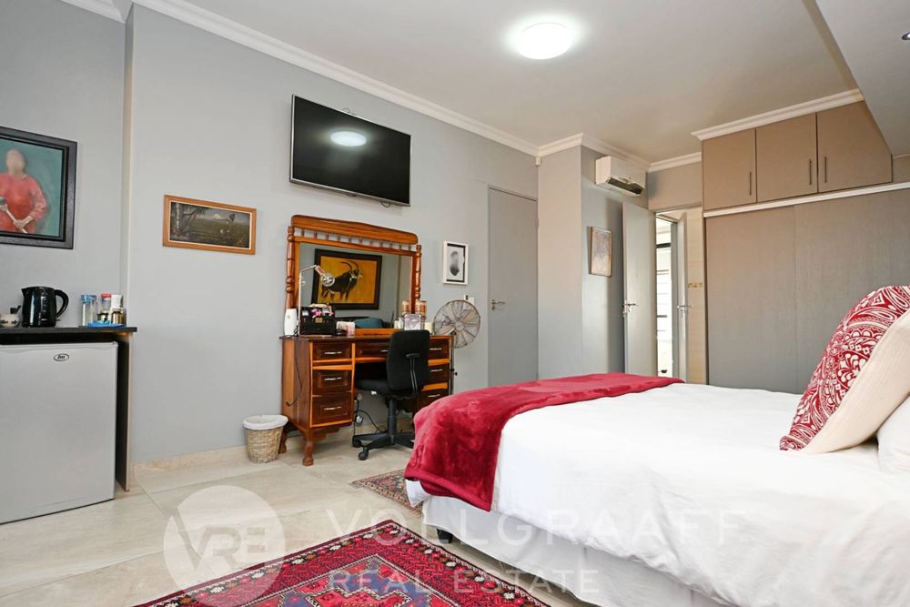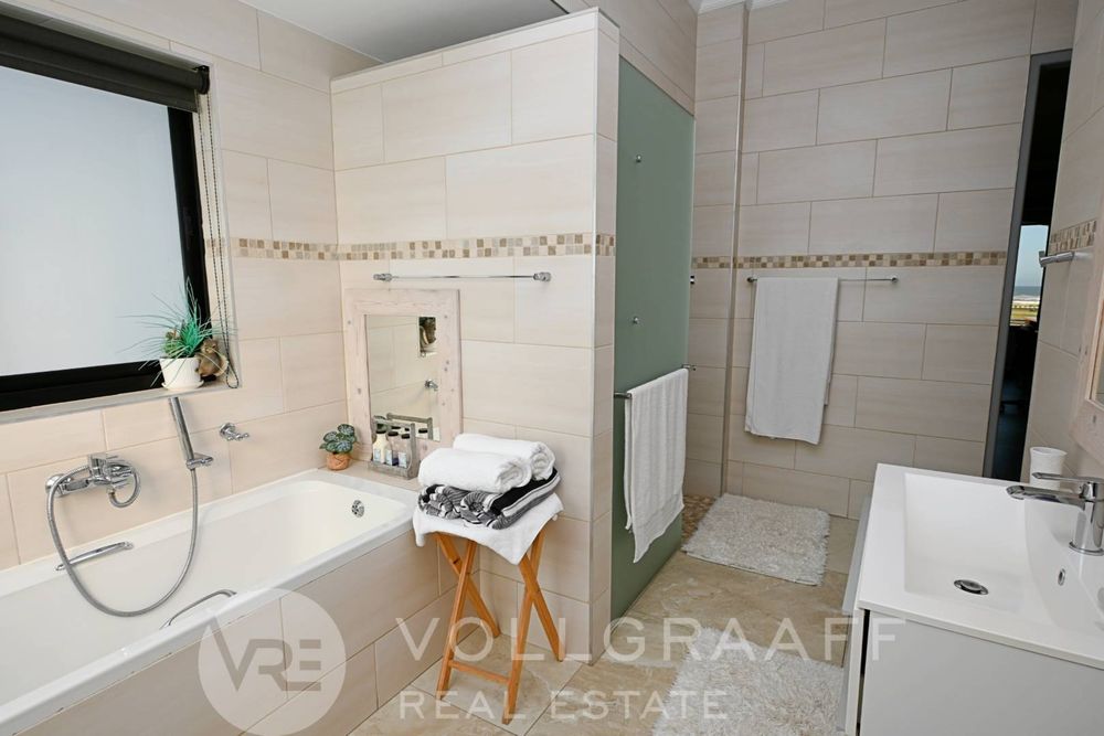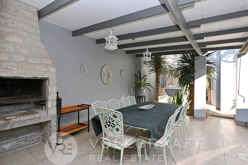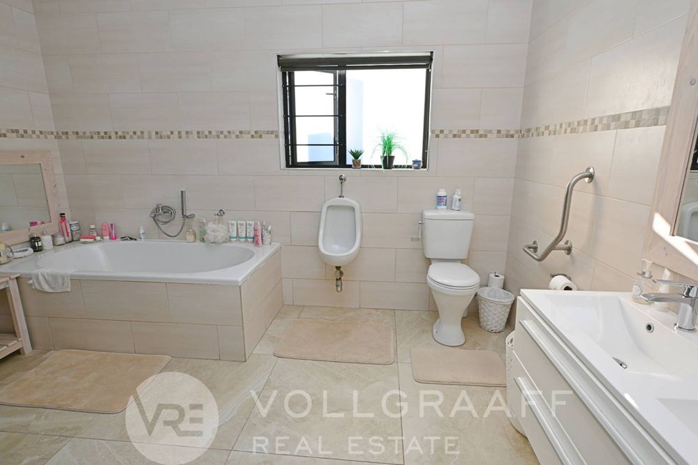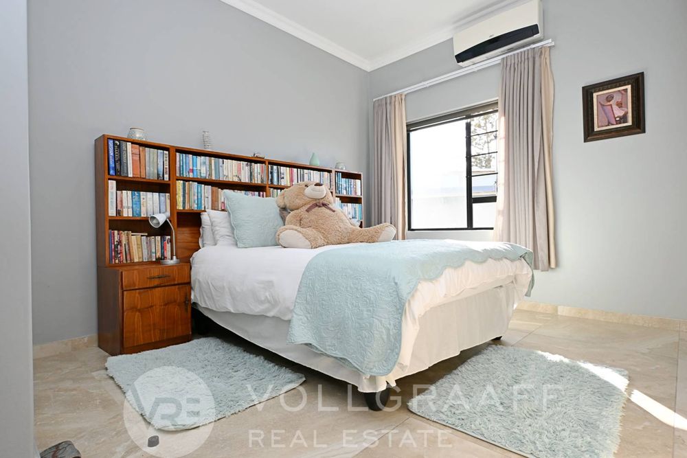 The main house boasts two expansive living areas, perfect for entertaining and relaxation. A modern, state-of-the-art kitchen equipped with high-end appliances, soft-close cupboards with integrated LED lighting, and a convenient scullery. There is also a convenient guest loo located downstairs.