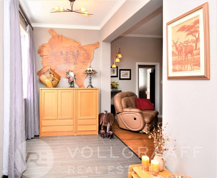 Modern family home in Kramersdorf with airy open-truss ceilings and inside braai for year-round entertaining; open-plan living, study, scullery. Three beds, two baths, double garage.