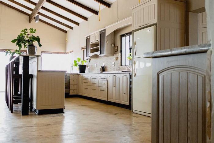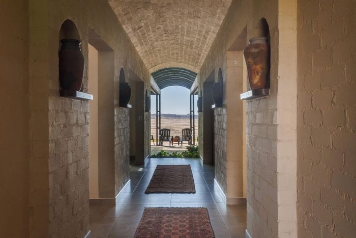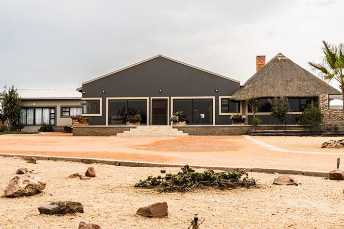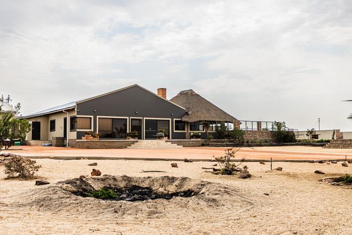 Live privately on Namibia's Moon Landscape beside the Swakop River, entertaining from a thatched-roof pavilion and pool. Main residence with seven bedrooms, seven baths and four garages.