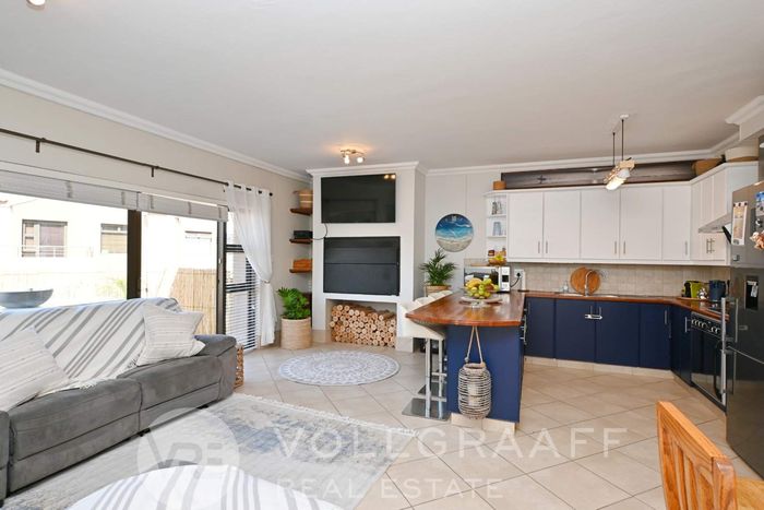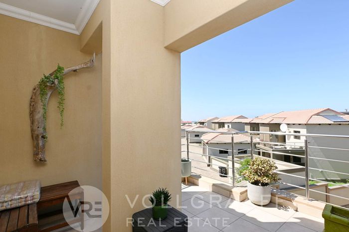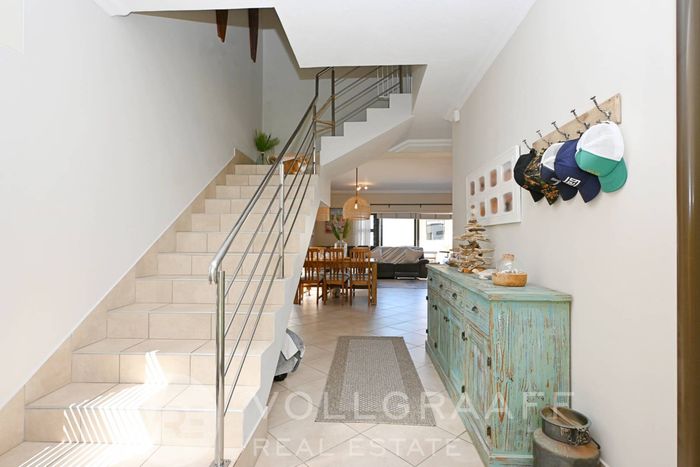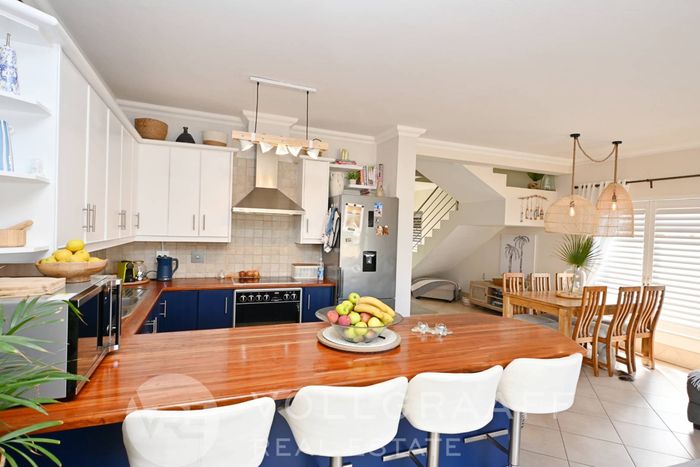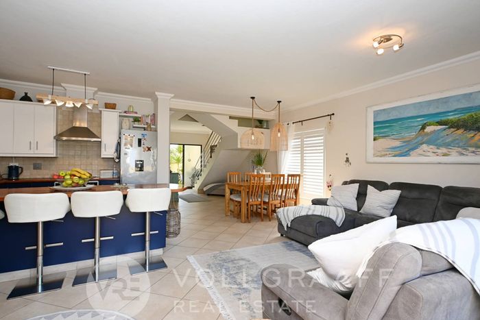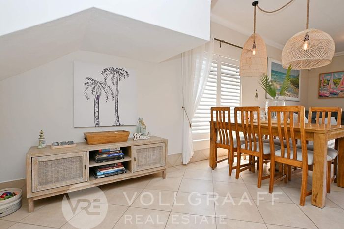 Coastal living steps from Dolphin Beach — open-plan townhouse with built-in braai, outdoor deck and private balcony with sea glimpses; front courtyard garden. Three beds, two baths and garage.