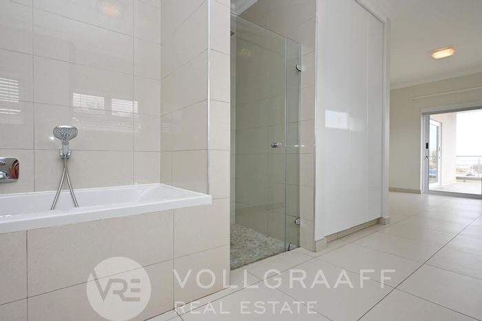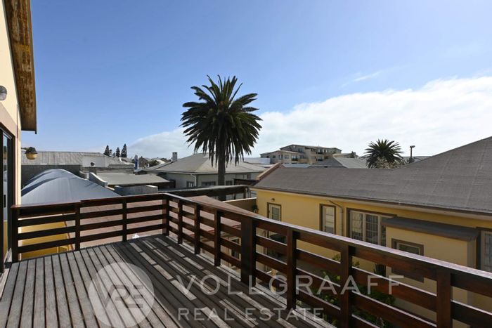 Walk-to-everything living in central Swakopmund, steps from the Mole and Super Spar, open-plan second-floor apartment with elevator access, two garages — three bedrooms, two bathrooms.