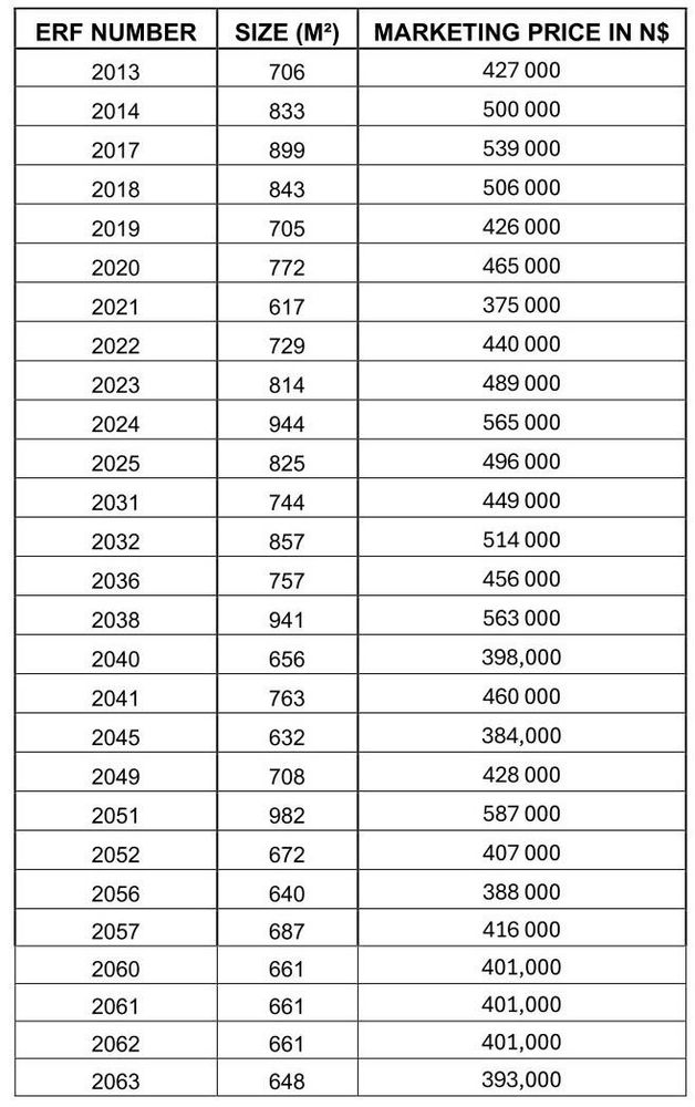 Prices range from N$375,000 to N$587,000. Contact us for the layout and available stands.