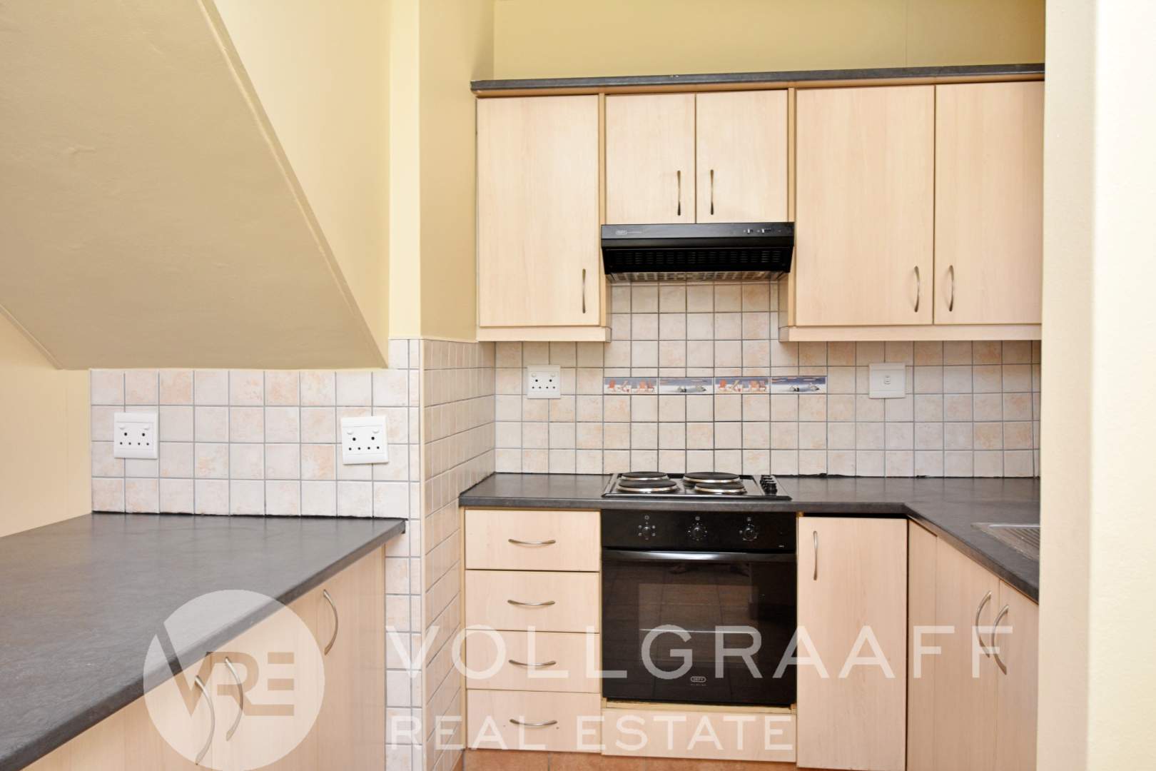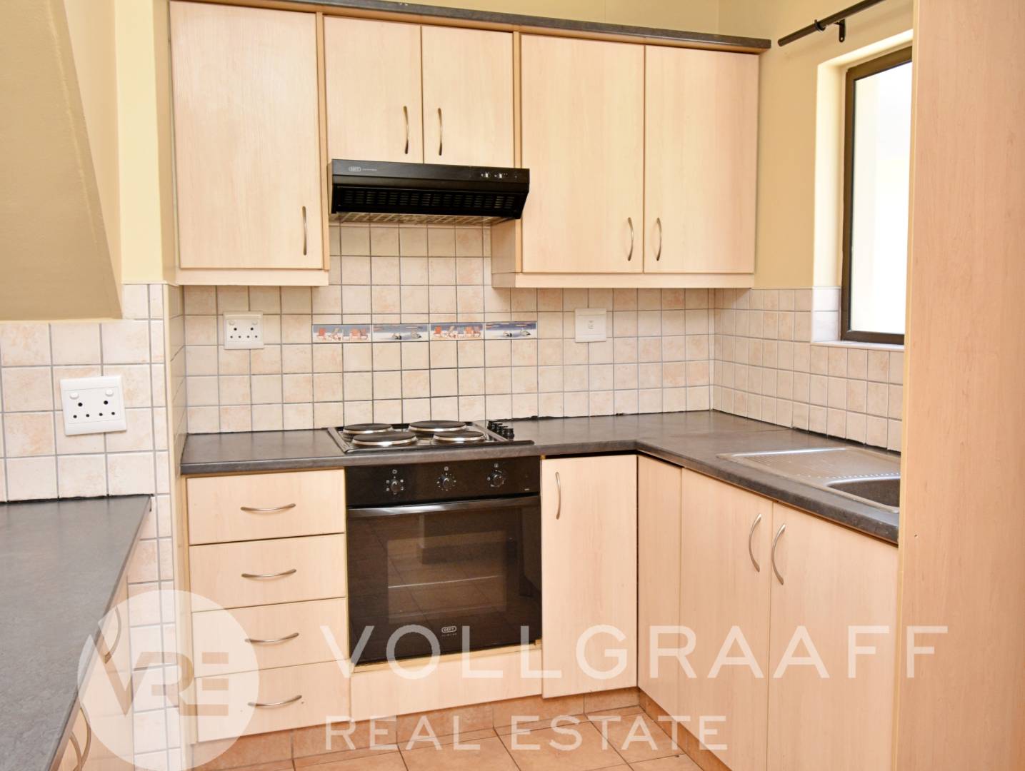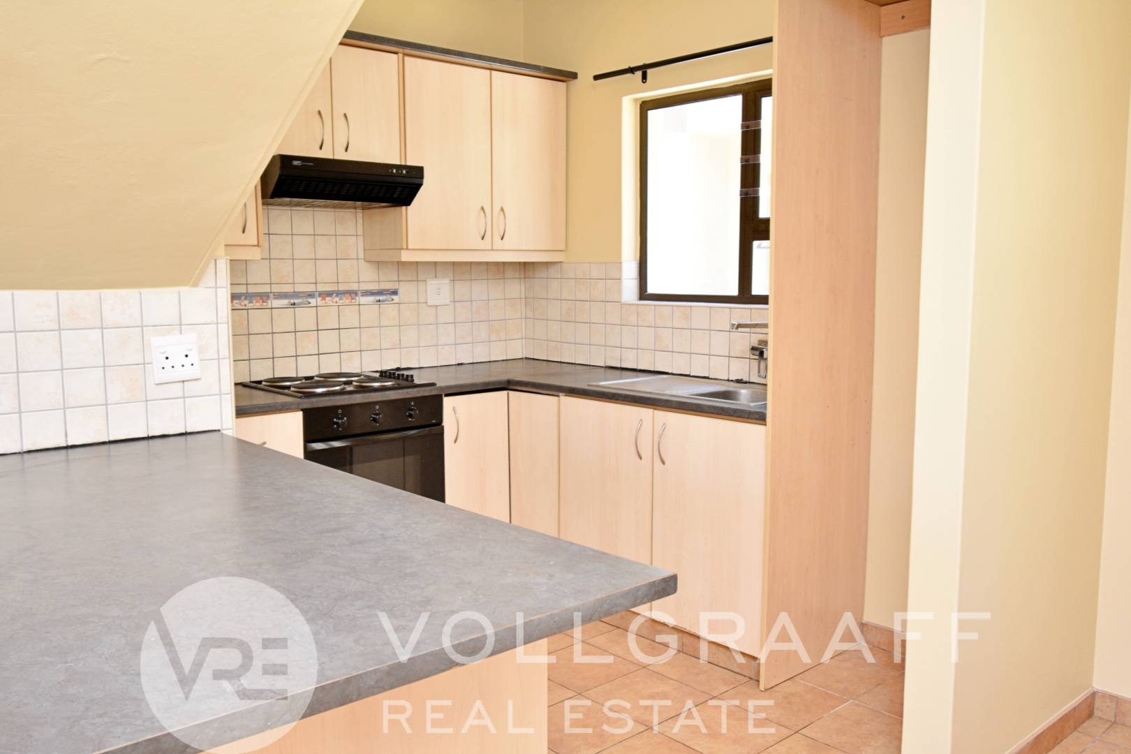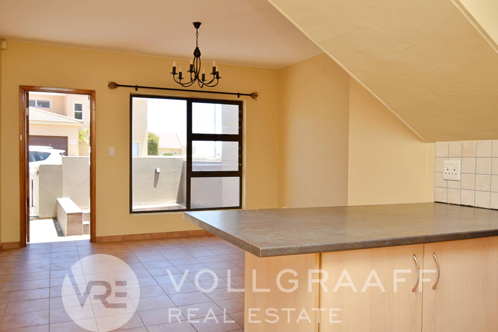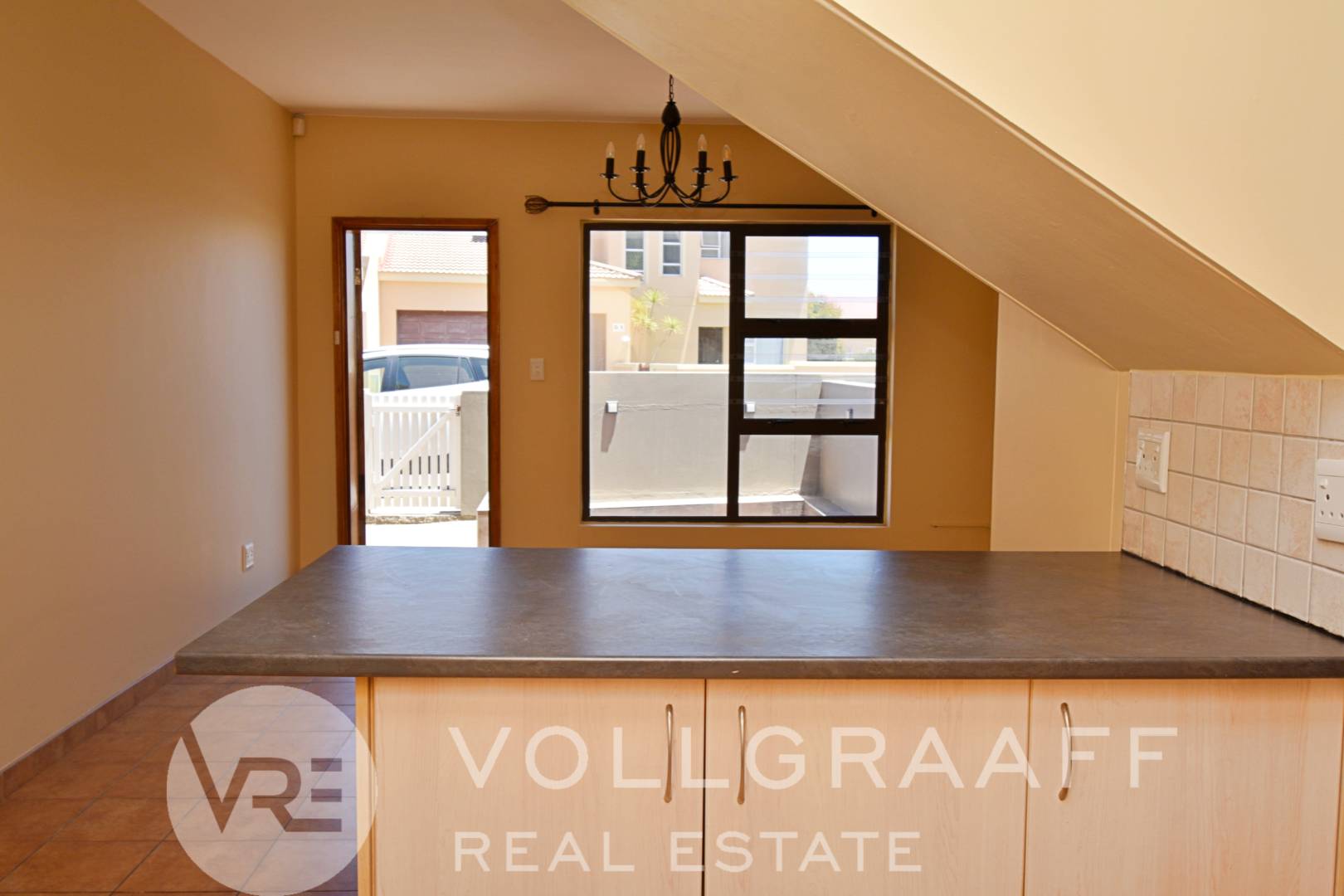 Duplex townhouse offering an open-plan living and kitchen area on the ground floor, with a guest toilet and a front yard featuring a boma braai. Single garage included.
