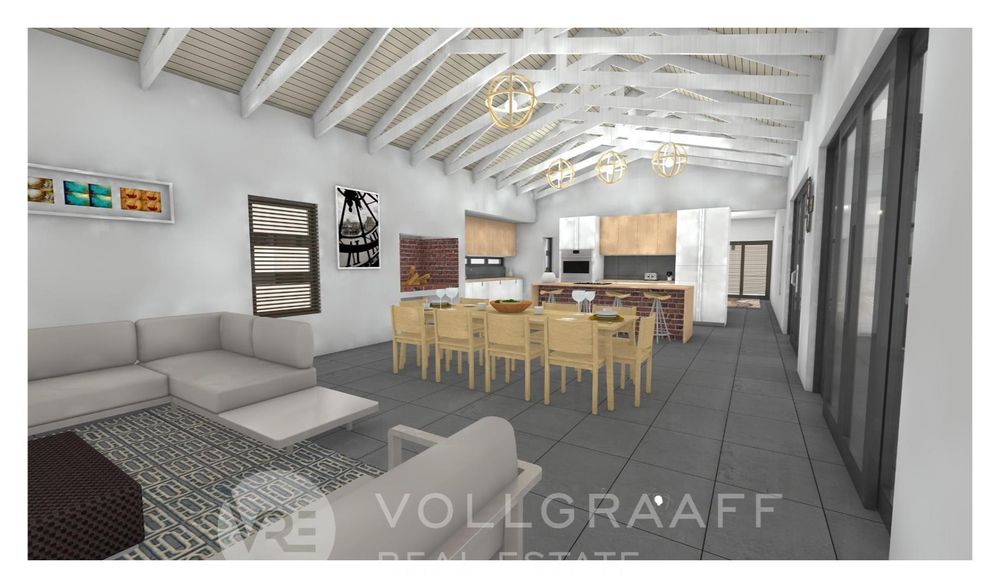 Step inside, and you’re welcomed by the kind of space that feels instantly comfortable. Light filters in from large sliding doors, spilling across the open-plan lounge, dining, and kitchen area. Ceilings with exposed trusses add character and volume, creating a sense of openness that’s both impressive and inviting. It’s easy to imagine morning coffee at the kitchen island or a relaxed family dinner as the sun sets outside.