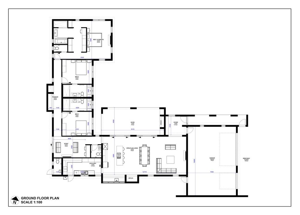 The main bedroom is quietly tucked to one side of the home — a private haven with its own en-suite bathroom and doors opening to the garden. Down the hallway, two additional bedrooms offer space for children, guests, or creative use, all thoughtfully placed around a stylish shared bathroom. There’s also a separate study nook or informal lounge — perfect for working from home or managing everyday tasks with ease.