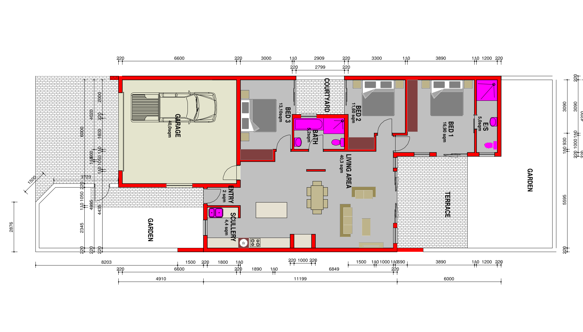 There will be 3 bedrooms and 2 bathrooms. The master bedroom will have an en-suite and the other bedrooms will share the second bathroom.