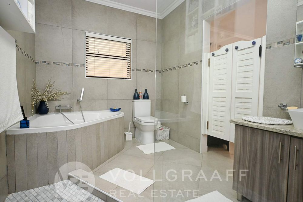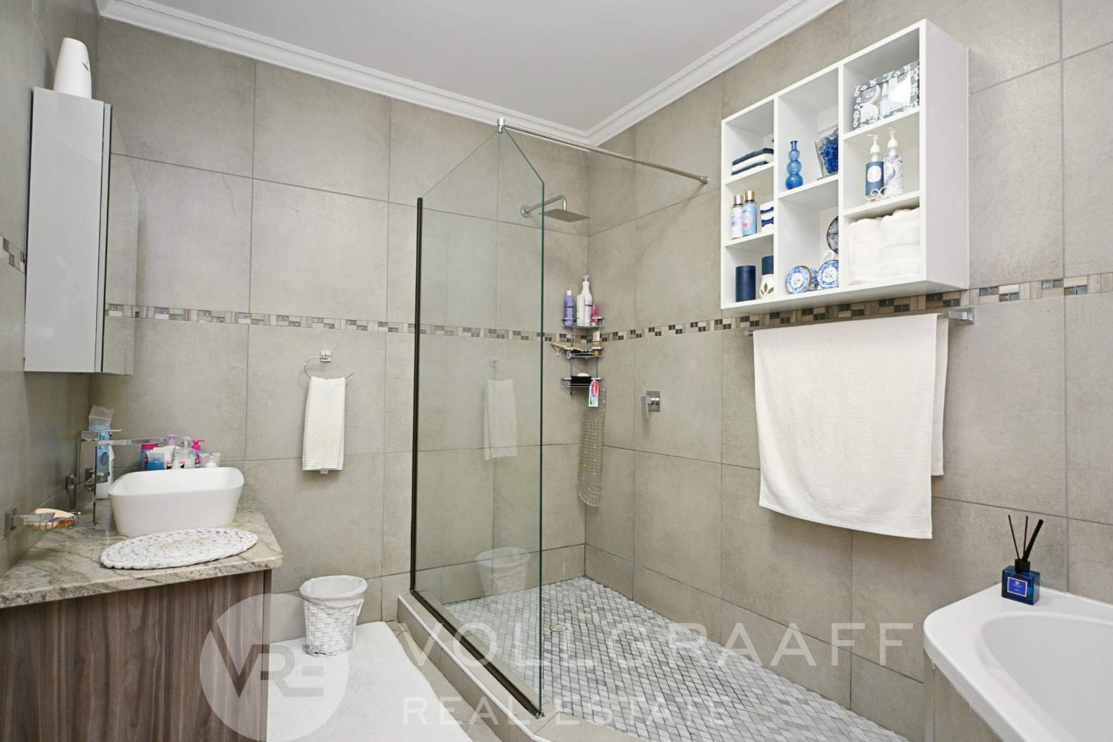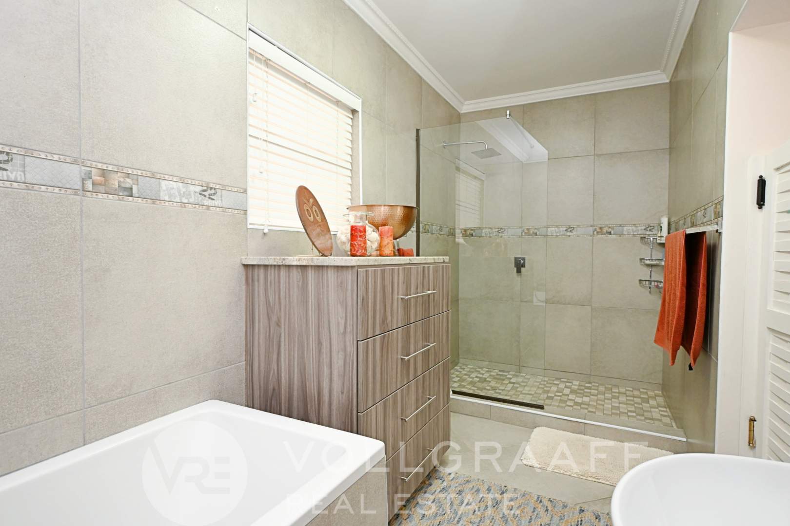 The home features an open-plan living and dining area with a cosy wood-burning fireplace, an indoor BBQ room, and a well-designed kitchen with breakfast nook and separate scullery. There are three bedrooms, two with full en-suite bathrooms, and a third family bathroom with shower, basin, and toilet.