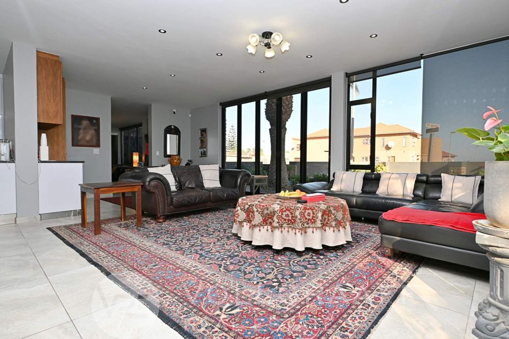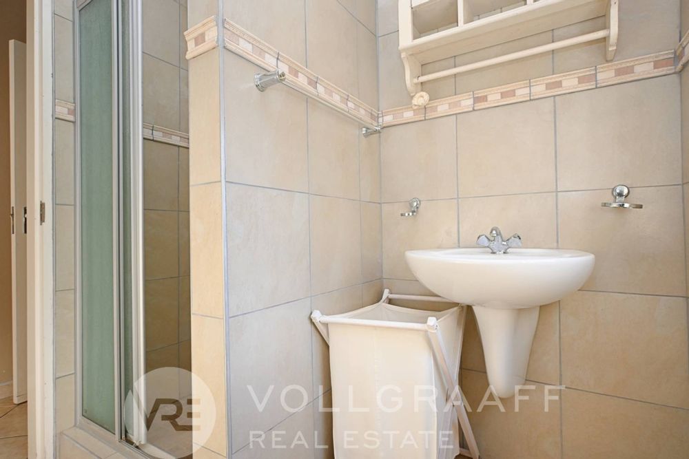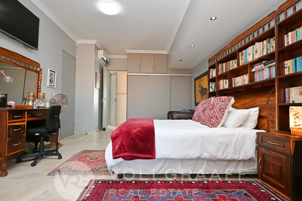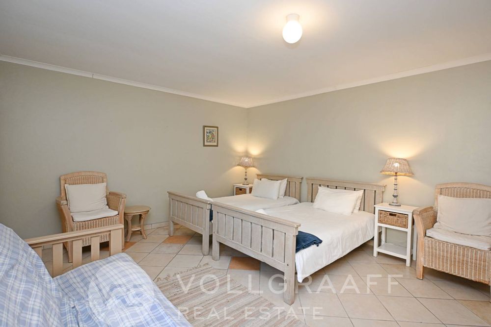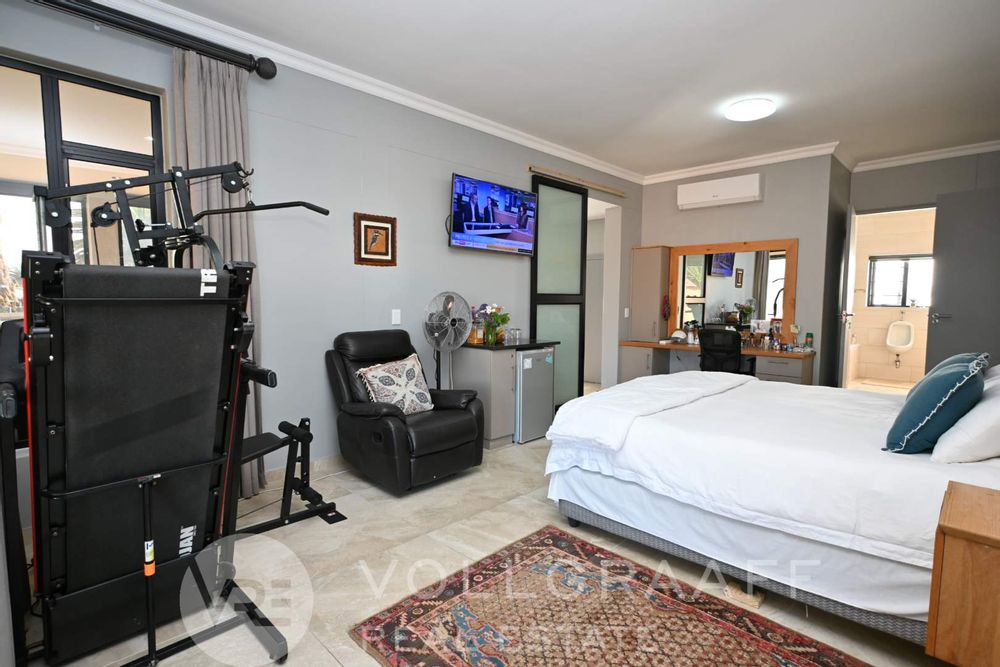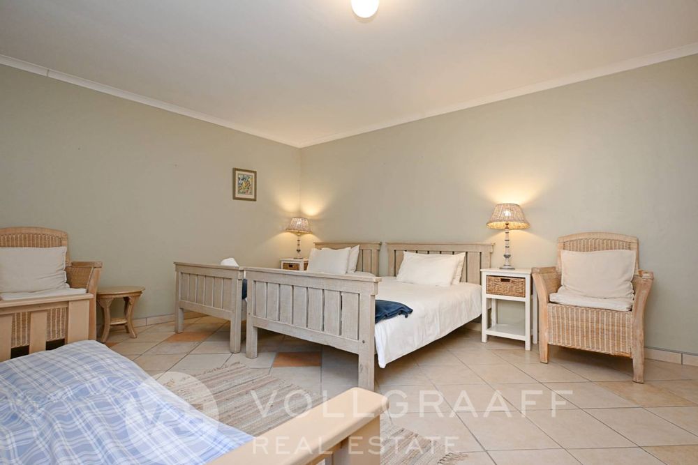 The main house boasts two expansive living areas, perfect for entertaining and relaxation. A modern, state-of-the-art kitchen equipped with high-end appliances, soft-close cupboards with integrated LED lighting, and a convenient scullery. There is also a convenient guest loo located downstairs.